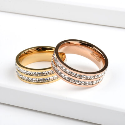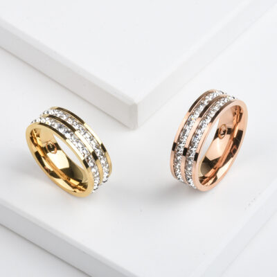 Điểm Âu Mỹ Cổ Điển Thời Trang Hợp Thời Trang Thép Titan Nhẫn Nữ Vàng 18K Bản Rộng Đôi Hàng Kim Cương Đầy Sao Nhẫn