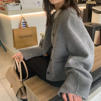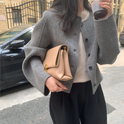 Điểm Hàn Quốc Dongdaemun 2023 đầu mùa thu mới không cổ túi nhỏ ngắn 2 mặt áo khoác len áo khoác nữ