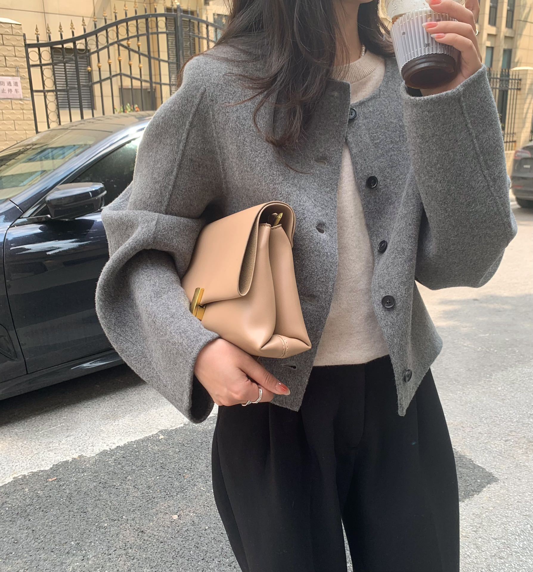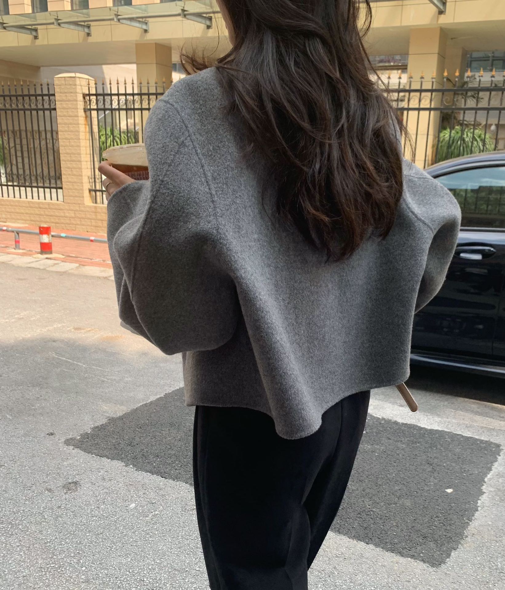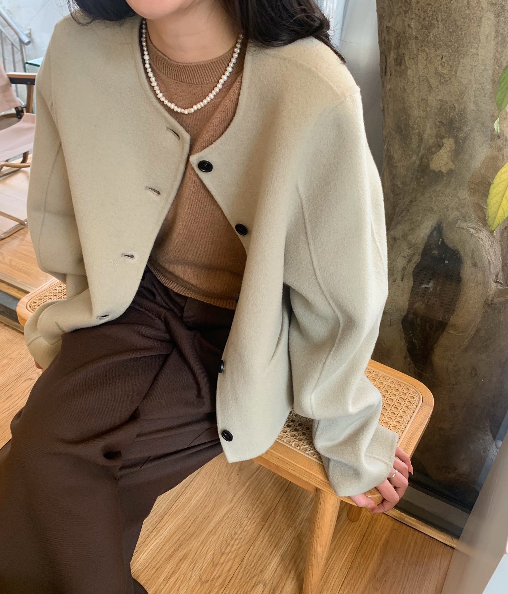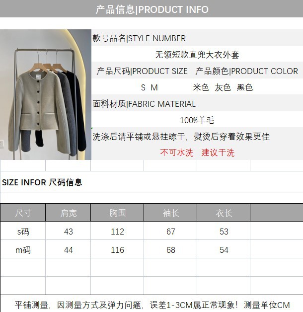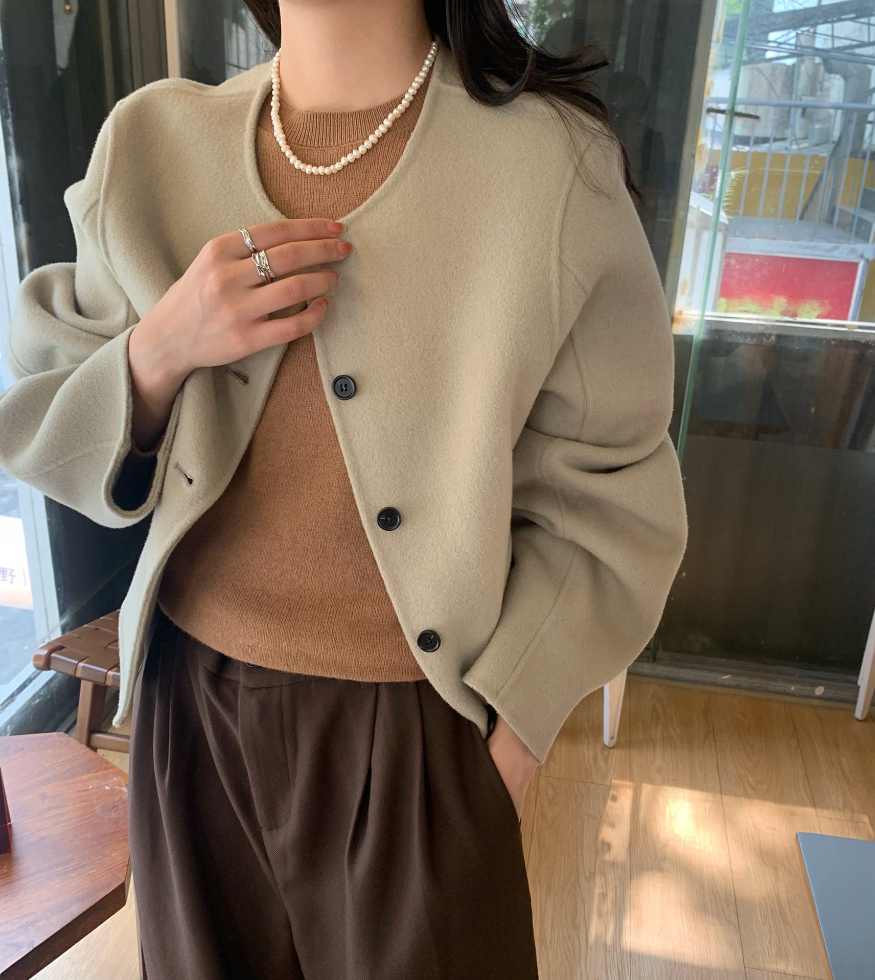 Điểm Hàn Quốc Dongdaemun 2023 đầu mùa thu mới không cổ túi nhỏ ngắn 2 mặt áo khoác len áo khoác nữ