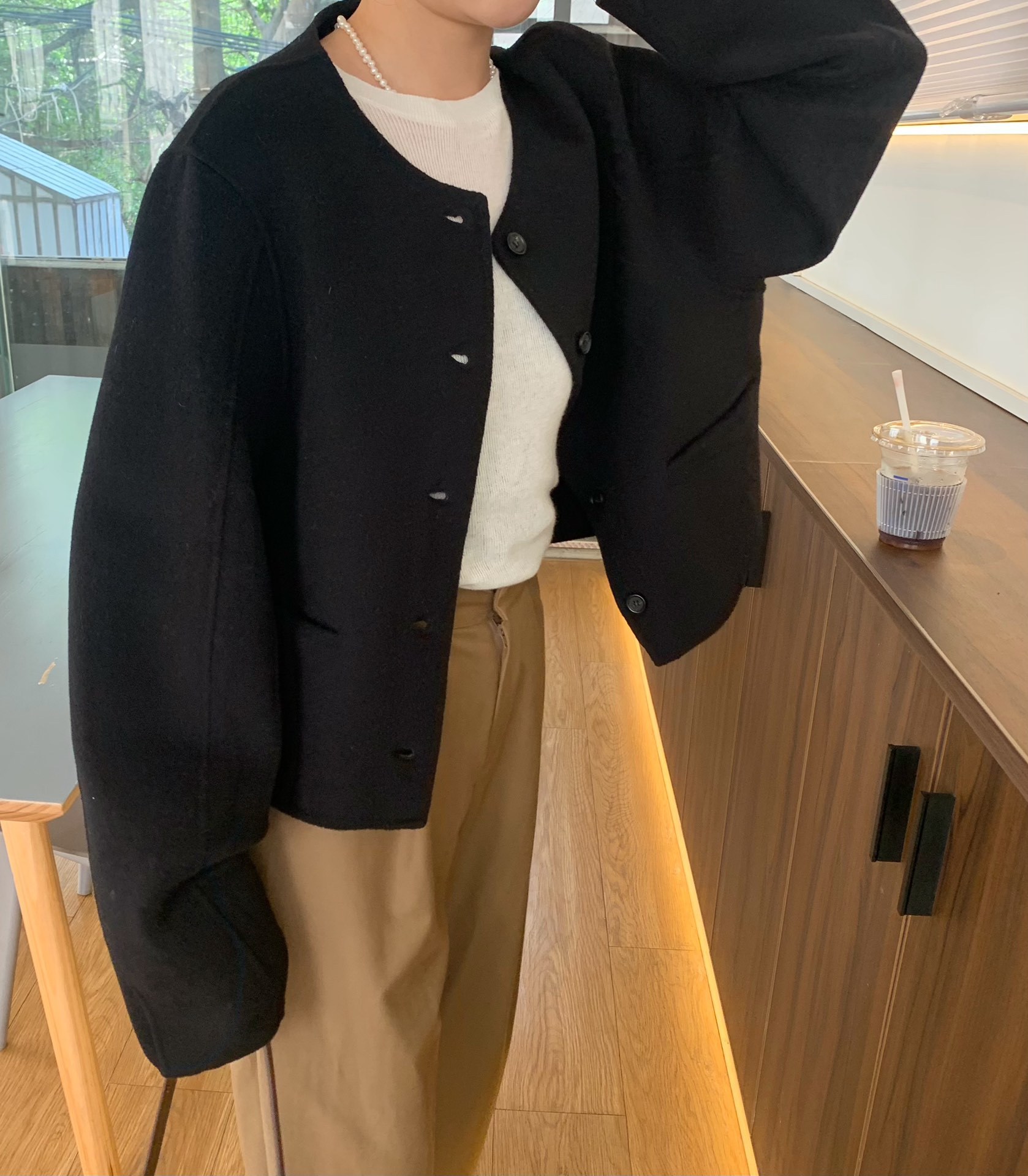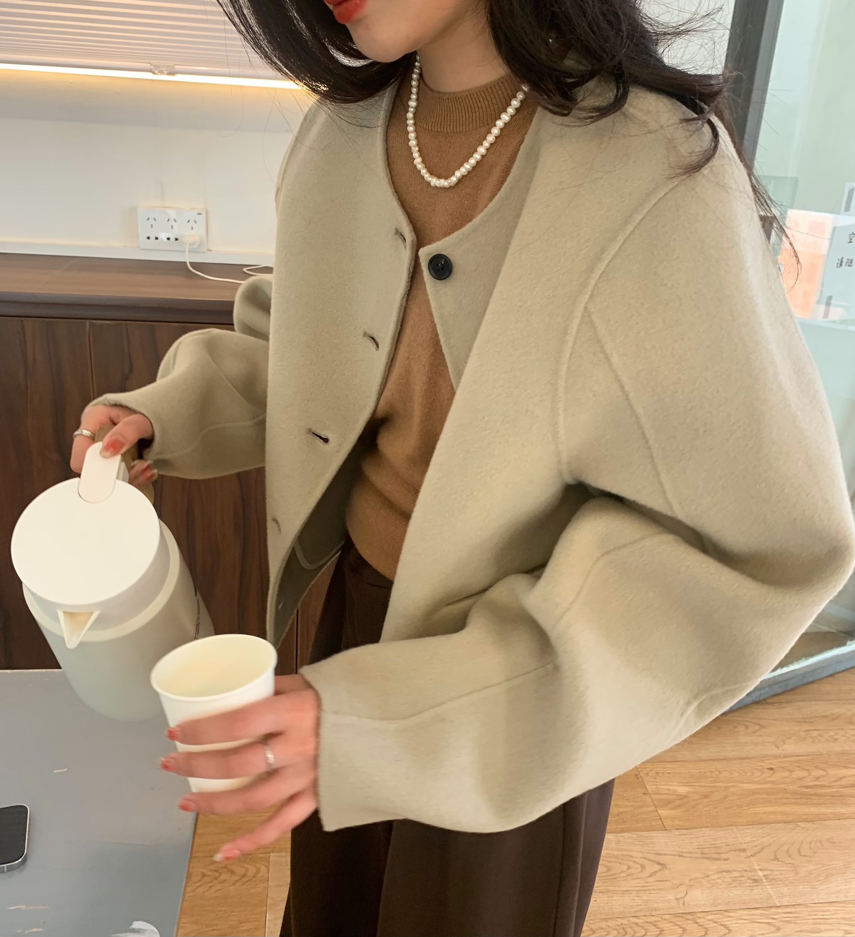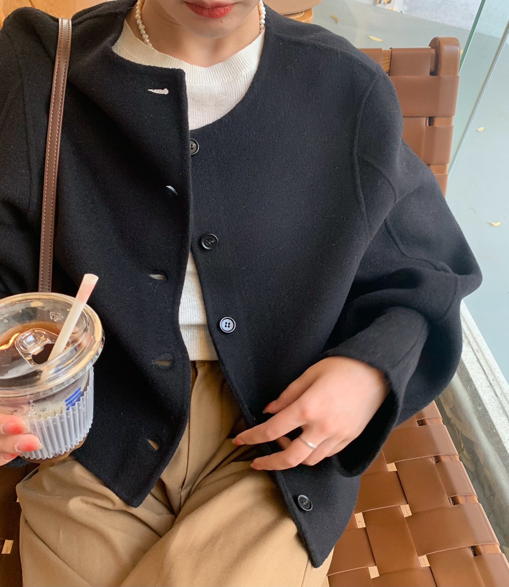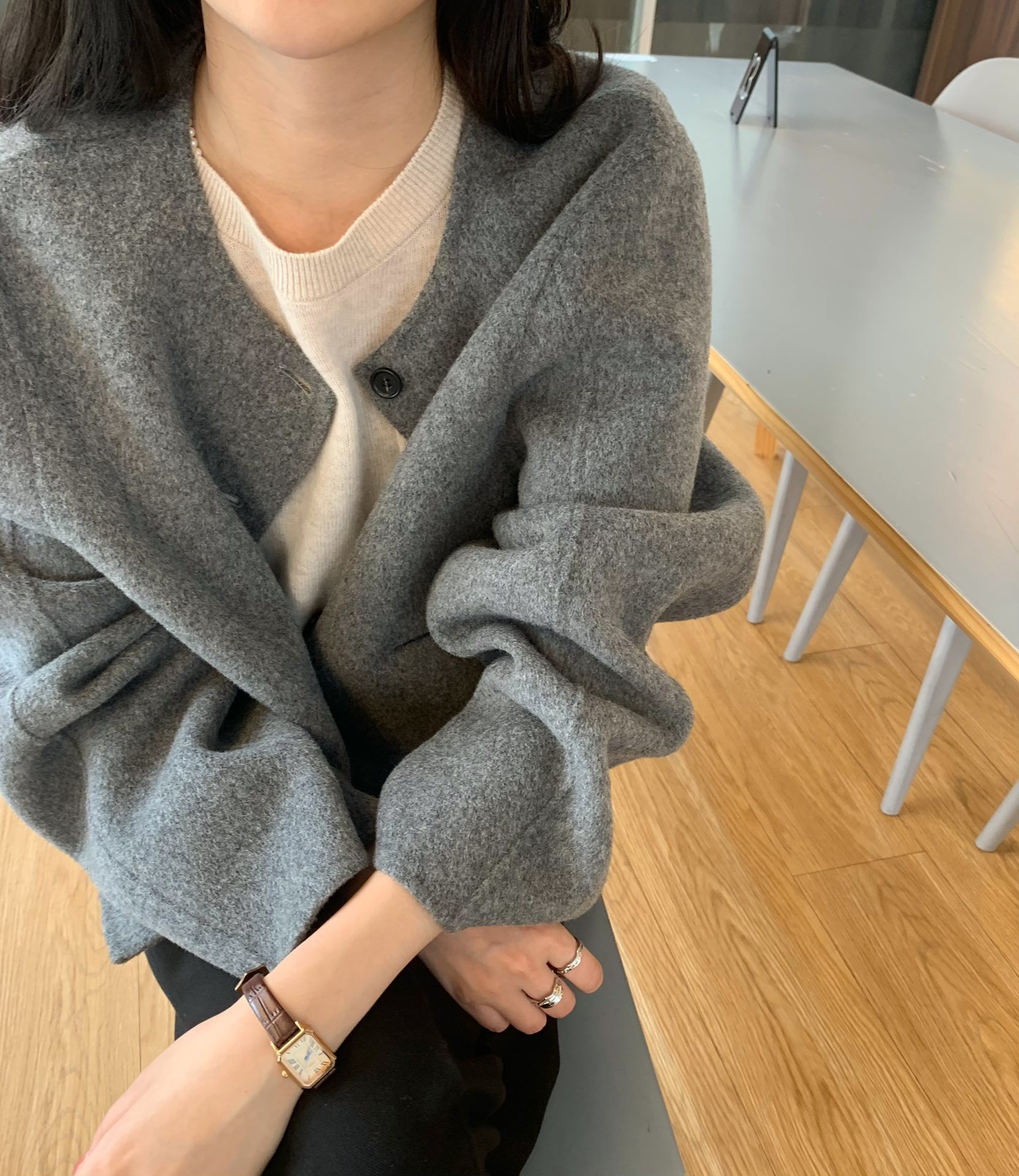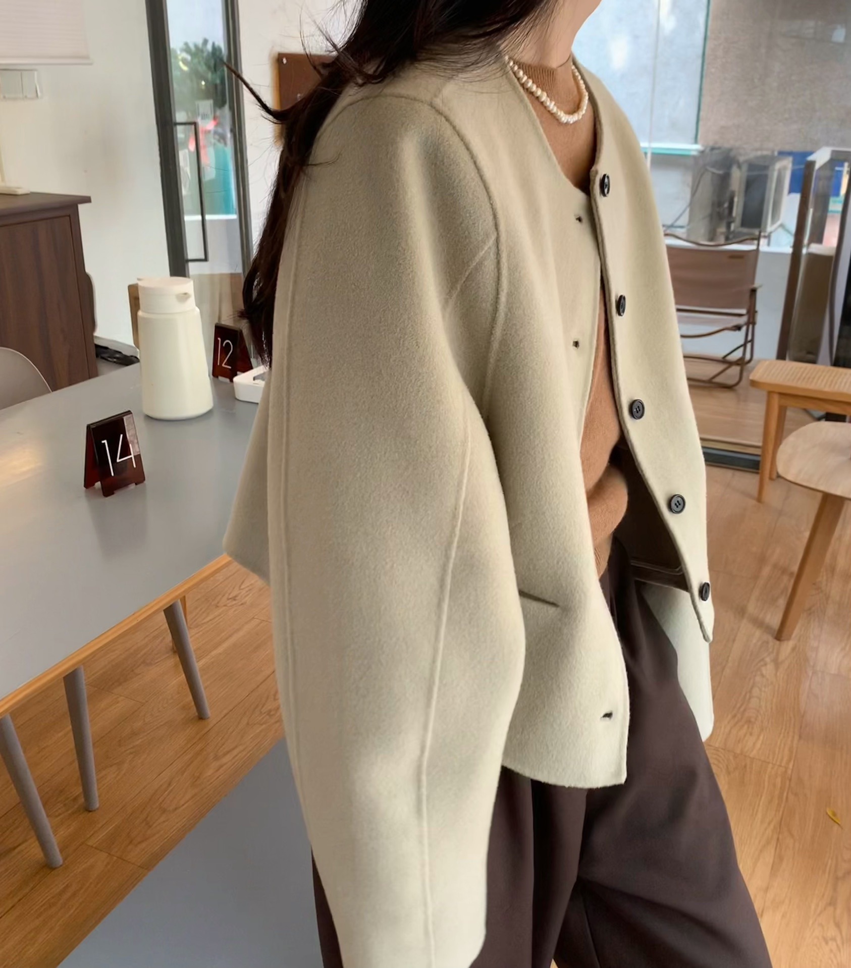 Điểm Hàn Quốc Dongdaemun 2023 đầu mùa thu mới không cổ túi nhỏ ngắn 2 mặt áo khoác len áo khoác nữ