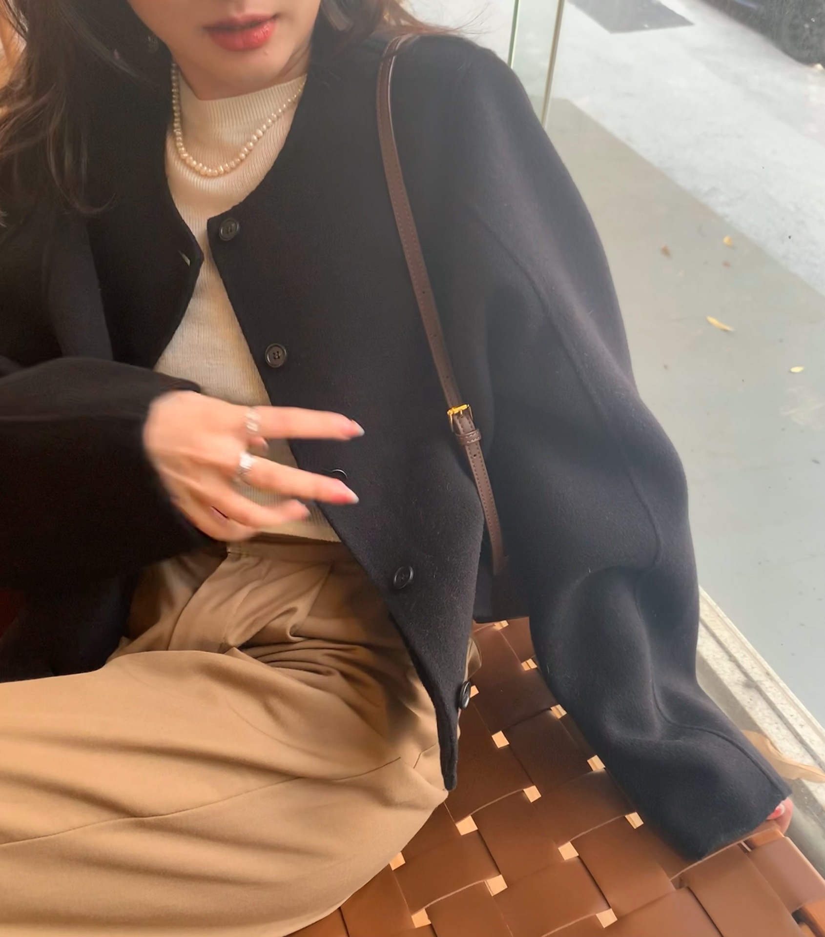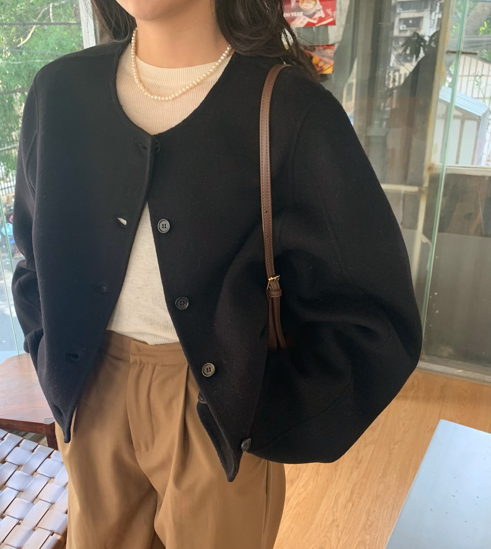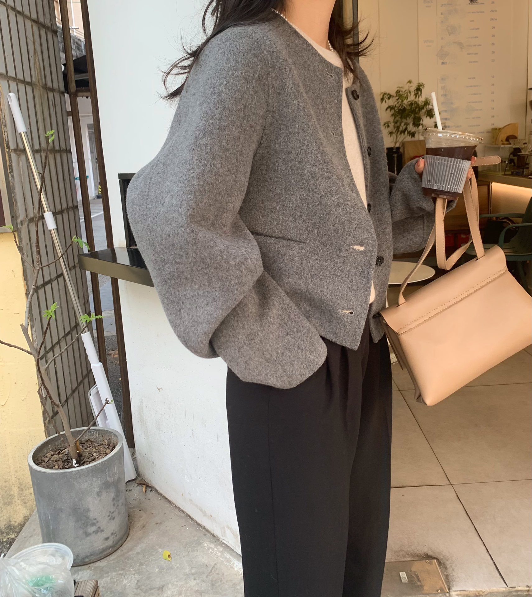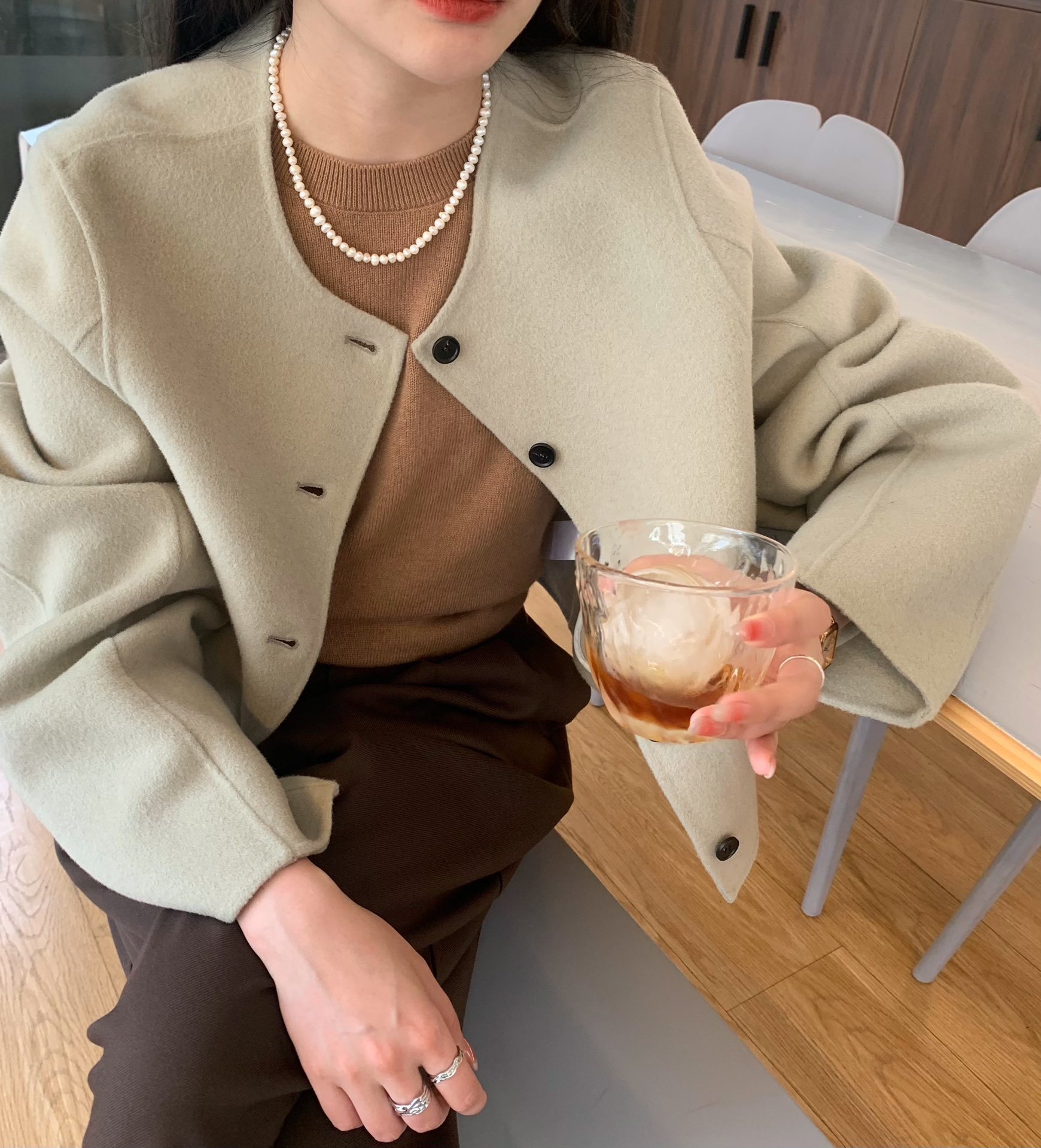 Điểm Hàn Quốc Dongdaemun 2023 đầu mùa thu mới không cổ túi nhỏ ngắn 2 mặt áo khoác len áo khoác nữ