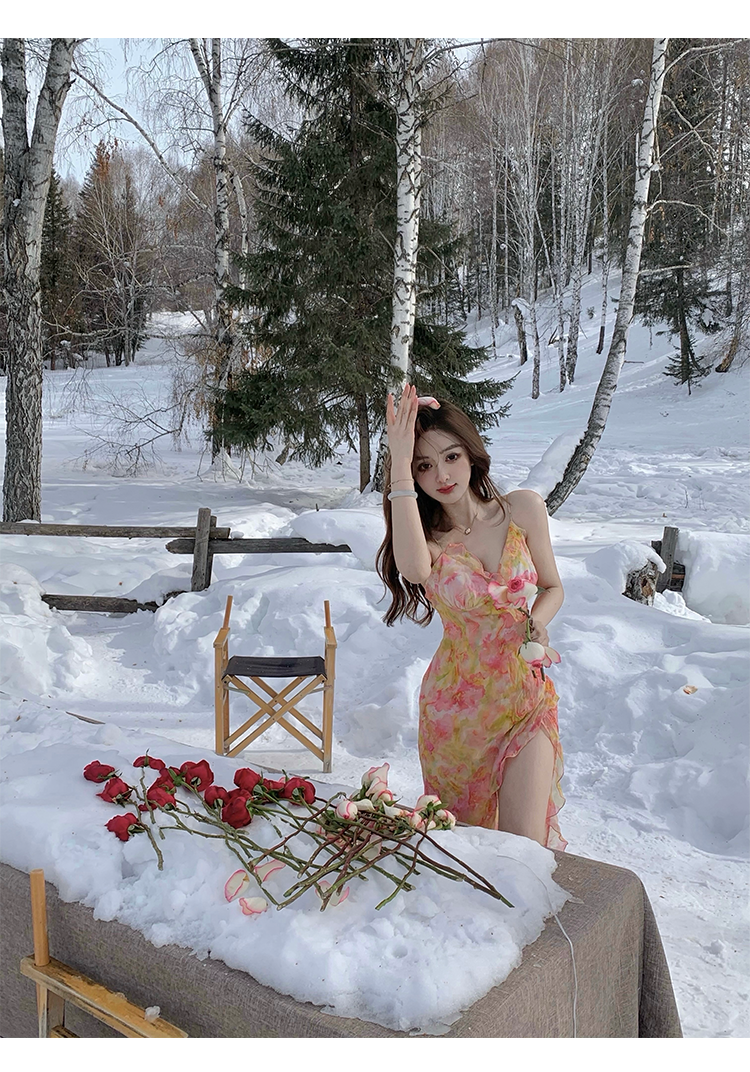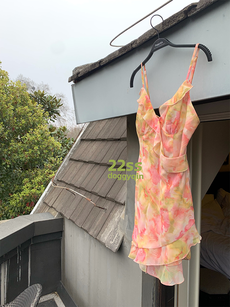 DoggyQin Broken Gold Rose / 2022 Spring / Summer French Romantic Sexy Print Váy ngắn Sling Slit Dress