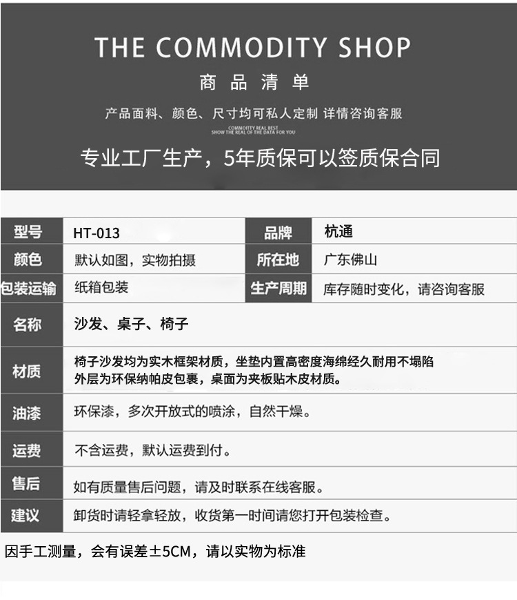 Mã sản phẩm: HT026 Nhãn hiệu: Hangtong Màu sắc: Sofa đôi màu vàng nâu/Sofa đôi màu trắng ngọc trai/Sofa đơn màu vàng nâu/Sofa đơn màu trắng ngọc trai/Bàn chữ nhật màu gỗ/Bàn hình bầu dục màu gỗ/Bàn tròn thấp 50*55/60 * Bàn tròn cao 50 / Bàn cà phê tròn ba cột 60 * 55 / Bàn cà phê tròn ba cột 60 * 55 Gấp: Không Model: HT026 Phương pháp xử lý: Tùy chỉnh theo bản vẽ Có bằng sáng chế hay không: Không Thông số kỹ thuật: 140 * 70 *78 Có mô hình 3D hay không: Có hay không Giao hàng tận nơi: Giao hàng xuống tầng dưới Có cung cấp dịch vụ lắp đặt hay không: Không Có phải là người nộp thuế chung hay không: Không Chức năng: Vật liệu khác: gỗ nguyên khối Không gian: Địa điểm thương mại Đối tượng áp dụng: Dù người lớn xuất khẩu xuyên biên giới Nguồn cung cấp đặc biệt: Không Kiểu dáng: Hiện đại và đơn giản. Quý khách có nhu cầu mua Bàn ghế quán café nhập khẩu vui lòng liên hệ với chúng tôi để được tư vấn hỗ trợ. Dịch vụ mua hàng Trung Quốc sẽ hỗ trợ quý khách mua hàng từ nhà cung cấp và giao tới tận tay quý khách hàng.