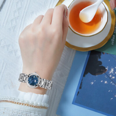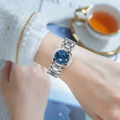 Đồng hồ đeo tay nữ nạm kim cương nhẹ sang trọng, giá trị cao, dây thép đơn giản, đồng hồ đeo tay nữ chống thấm nước, đồng hồ thạch anh tấm xanh Xingyue