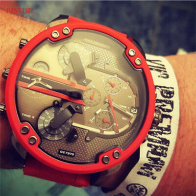 - 商务休闲,个性超大表盘,欧洲风格,双时区,红色手表,带日历防水钢带手表。