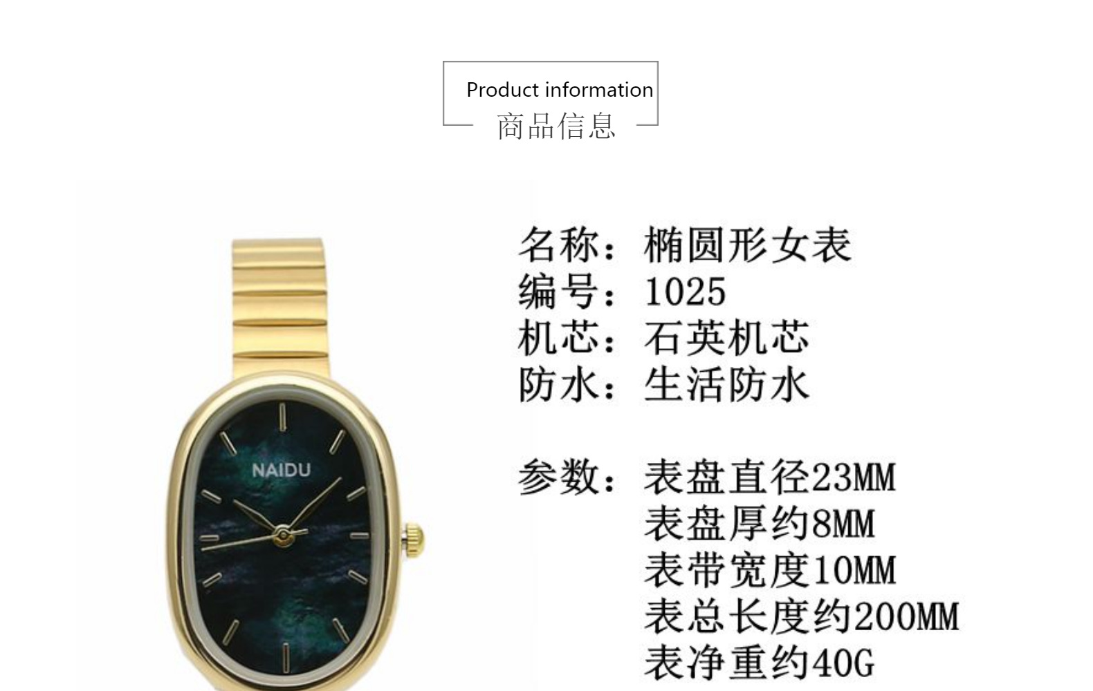 Nhãn hiệu bộ máy: Khác Cho dù Nguồn bằng sáng chế: Không Màu sắc: Vàng Đai Xanh lá/Vàng Trắng Bề mặt/Vỏ vàng Bề mặt Cà phê/Bạc Bạc Bề mặt Trắng/Bạc Bạc Bề mặt Xanh lam/Bạc Bạc Bề mặt Hồng/Bạc Bạc Bề mặt Hồng Độ dày Bề mặt: 8mm Loại khóa Kiểu dáng: Khóa chốt Đường kính mặt số: 23mm Hình dạng mặt số: Hình bầu dục Chống nước: Không Chất liệu khóa: Vàng hồng Dịch vụ sau bán hàng: Bảo hành tại cửa hàng Nguồn cung cấp: Có Thương hiệu: NAIDU Mã sản phẩm: 1009 Kiểu máy: SL68 Loại máy: Thạch anh Chất liệu dây đeo: Không gỉ Thép Đối tượng áp dụng: Phổ thông Loại đáy: Thông thường Loại vương miện: In vương miện xoắn ốc LOGO: Có sẵn Các nền tảng hạ nguồn chính: ebay/Amazon/wish/AliExpress/Independent Station/LAZADA/LAZADA đã ủy quyền thương hiệu riêng: Không có gương Chất liệu: Gương thủy tinh thông thường Năm niêm yết /Mùa: Thu 2022 Loại màn hình: Con trỏ Phong cách: Thời trang Khu vực bán hàng chính: Châu Phi/Châu Âu/Nam Mỹ/Bắc Mỹ/Đông Bắc Á/Trung Đông/Trung Đông Nhập khẩu: Không có phong trào Xuất xứ: Trung Quốc Chất liệu vỏ: Hợp kim