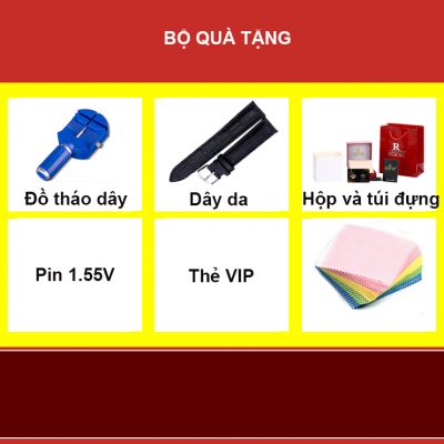 Bộ sản phẩm bao gồm : 1 sản phẩm, 1 box, 1 pin tặng kèm, 1 thẻ bảo hành. 1 dây da. 1 thiết bị tháo dây.