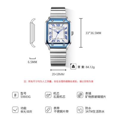 Bộ máy Thương hiệu: Nhật Bản MIYOTA Citizen được cấp bằng sáng chế Nguồn: Không Màu sắc: 11S9883G01/11S9883G02/11S9883G02 Mẫu: S9883G Độ dày: 6,5MM Chức năng đặc biệt: Trang trí/Sáng/Lịch/Khác/Kiểu khóa: Khóa treo Đường kính mặt số: 33 * 36,5MM Hình dạng: Hình vuông Chống thấm nước: Có Hiệu suất chống thấm nước: 30M Chất liệu khóa: Thép không gỉ Dịch vụ hậu mãi: Bảo hành tại cửa hàng Số mặt hàng: S9883G Kiểu máy: 2035 Loại máy: Thạch anh Chất liệu dây đeo: Thép không gỉ Đối tượng sử dụng: Vỏ nam Loại đáy: Vương miện thông thường Loại: Vương miện xoắn ốc LOGO in: Có sẵn Các nền tảng hạ lưu chính: ebay/Amazon/Wish/Speed Sell/Independent Station/LAZADA/Others/Others Thương hiệu riêng được ủy quyền: Có Chất liệu gương: Kính khoáng cường lực Gương Năm/mùa niêm yết: Mùa xuân 2023 Loại màn hình : Con trỏ Phong cách: Phong cách thời trung cổ Các khu vực bán hàng chính: Châu Phi/Châu Âu /Nam Mỹ/Đông Nam Á/Bắc Mỹ/Đông Bắc Á/Trung Đông/Khác/Khác Nhập khẩu: Không có máy Xuất xứ: Nhật Bản Chất liệu vỏ: Hợp kim
