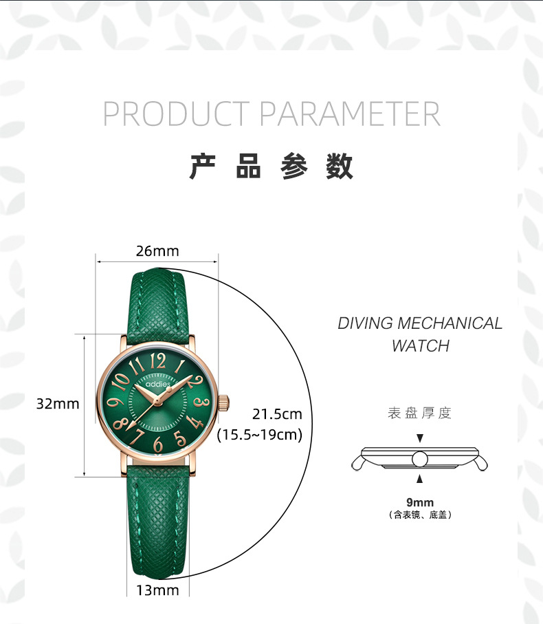 Thương hiệu bộ máy: Bộ máy Nhật Bản Nguồn bằng sáng chế: Không Màu sắc: Đai đen Bề mặt trắng/Đai đen Bề mặt xanh lục/Đai Milan Bề mặt vàng nhạt/Dây xanh lục Bề mặt xanh lá cây/Đai xanh lục Bề mặt xanh lá Model: MY-B36 Độ dày: 9mm Các tính năng đặc biệt: Kiểu khóa khác : Khóa chốt Đường kính mặt số: 26mm Hình dạng mặt số: tròn Chống thấm nước: Có Hiệu suất chống thấm nước: 30M Chất liệu khóa: Thép không gỉ Dịch vụ hậu mãi: Bảo hành tại cửa hàng Quy cách đóng gói: Bao bì gốc Xuất xứ (trong nước): Tỉnh Quảng Đông Tùy biến gia công: Có hoặc không Cung cấp độc quyền để xuất khẩu xuyên biên giới: Có Thương hiệu: addies/ Eddie Kiểu máy: VJ21 Loại máy: Thạch anh Chất liệu dây đeo: Da Đối tượng sử dụng: Nữ Vỏ Loại đáy: Thông thường Loại vương miện: Đỉnh phẳng Vương miện hình nón có in thêm LOGO: Có Các nền tảng hạ nguồn chính: ebay /Amazon/wish/AliExpress/Trạm độc lập/LAZADA/LAZADA Đã ủy quyền thương hiệu riêng: Có Chất liệu gương: Gương kính cường lực khoáng Năm/mùa niêm yết: Mùa hè 2023 Loại màn hình: Kiểu con trỏ: Thông thường Khu vực bán hàng chính: Châu Âu/Nam Mỹ/Đông Nam Châu Á/Bắc Mỹ/Đông Bắc Á/Đông Bắc Á Có nhập khẩu hay không: Không có máy Xuất xứ: Nhật Bản Chất liệu vỏ: Thép không gỉ