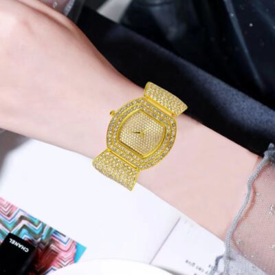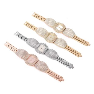 Đồng hồ nữ thời trang sang trọng phù hợp với mặt số lớn khảm đầy kim cương Đĩa kim cương đáy hình cánh hoa dây đeo bằng thép đồng hồ thạch anh