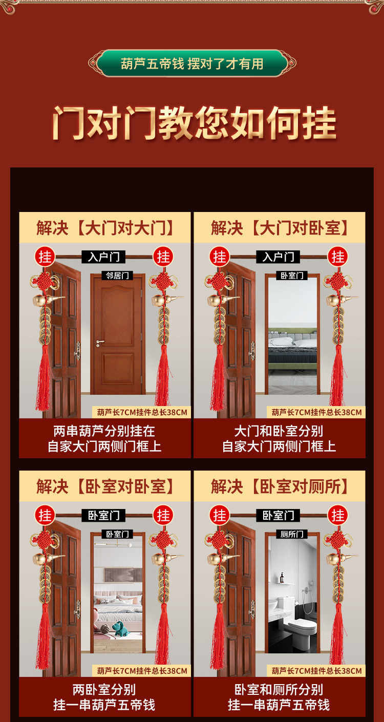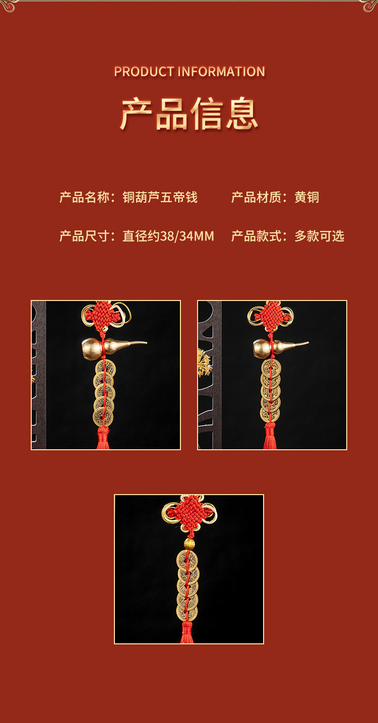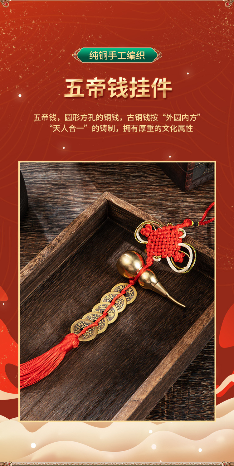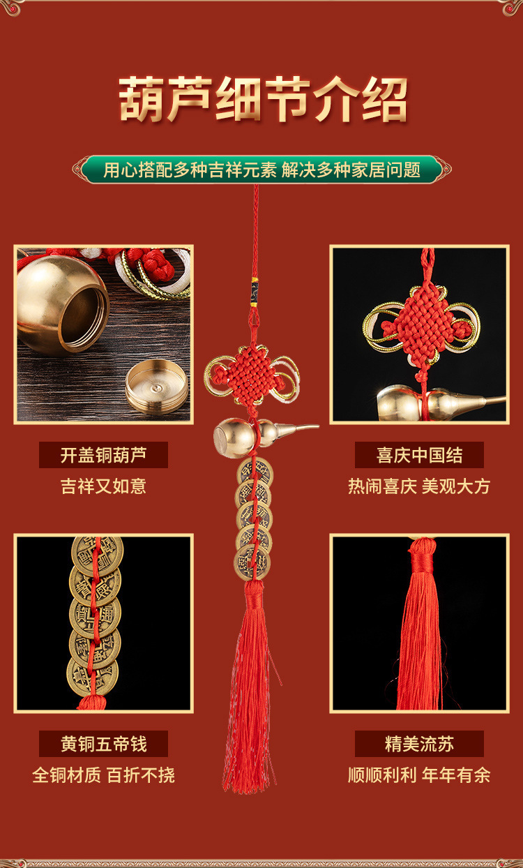 Đồng nguyên chất ngũ hoàng tiền cửa mặt dây chuyền gỗ đào bầu đồng bầu Trung Quốc thắt nút tua hộ gia đình đồ cổ ngũ hoàng tiền xu