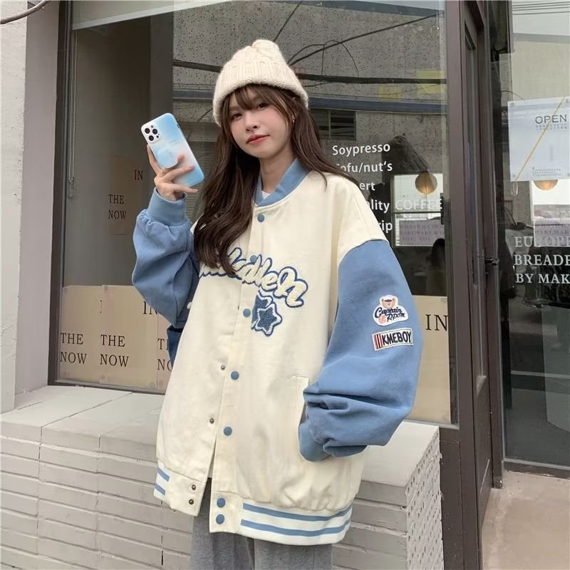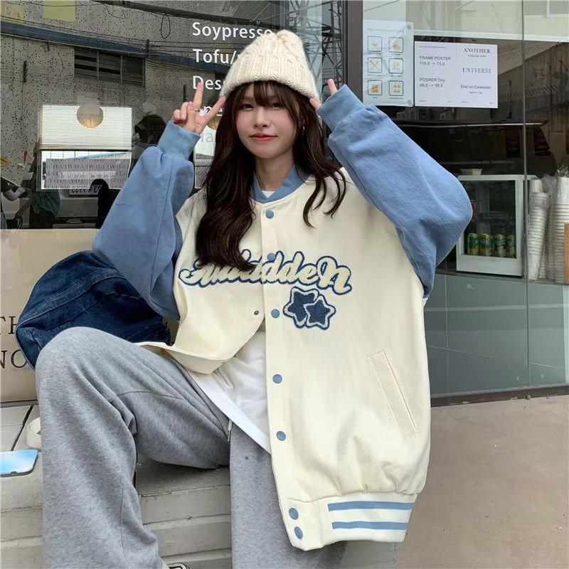 Đồng phục bóng chày cổ điển của phụ nữ mùa xuân và mùa thu áo khoác rộng phong cách Hồng Kông phong cách đường phố cao kết hợp màu sắc tương phản quần áo thường ngày
