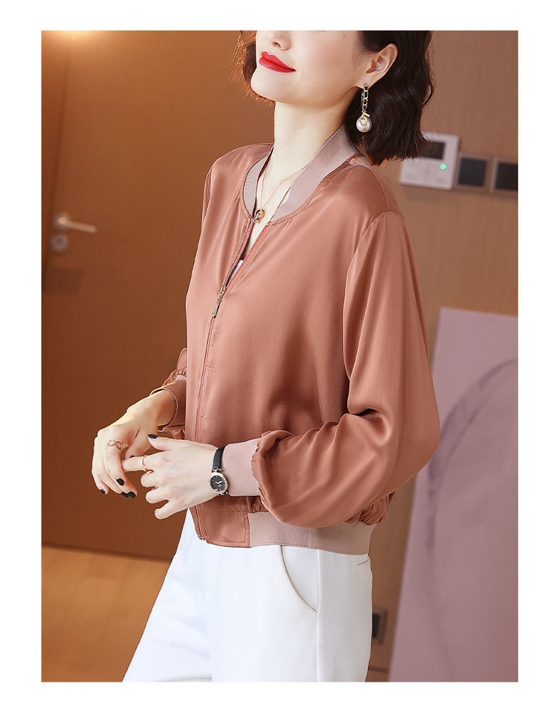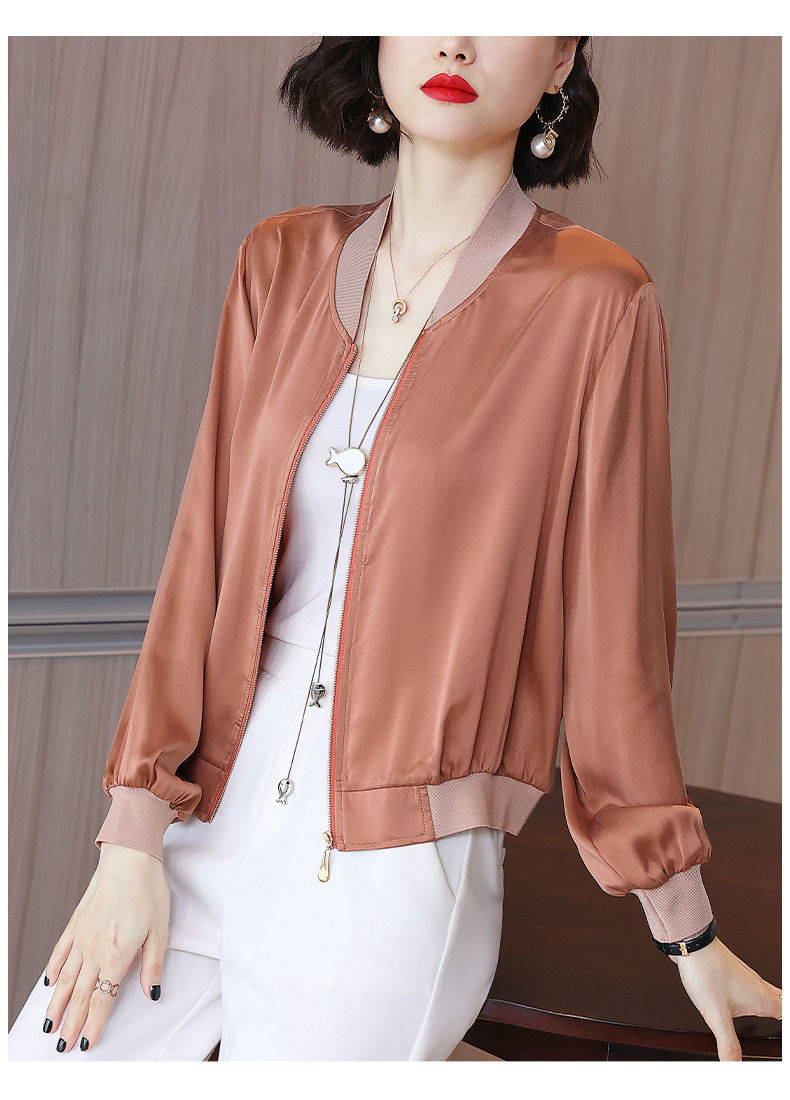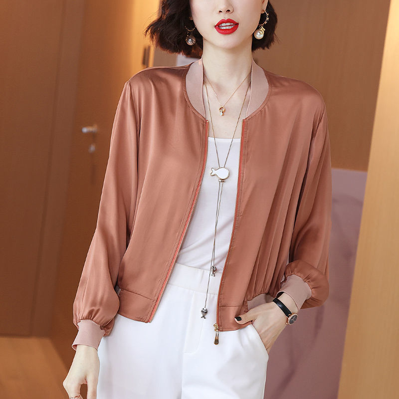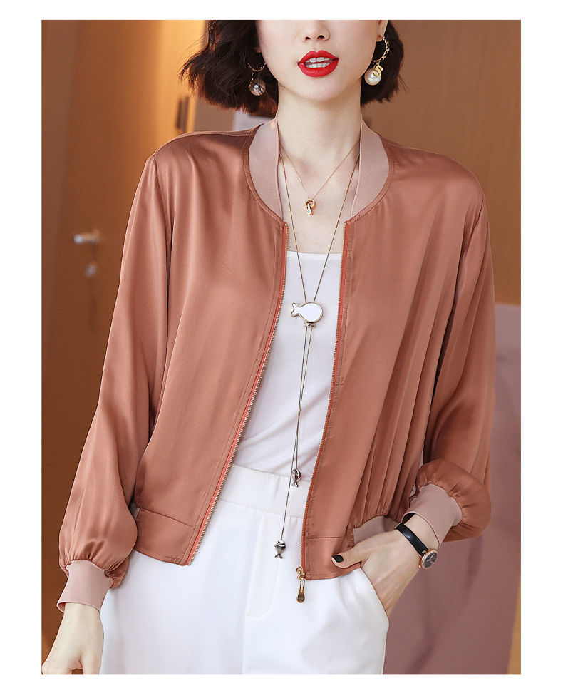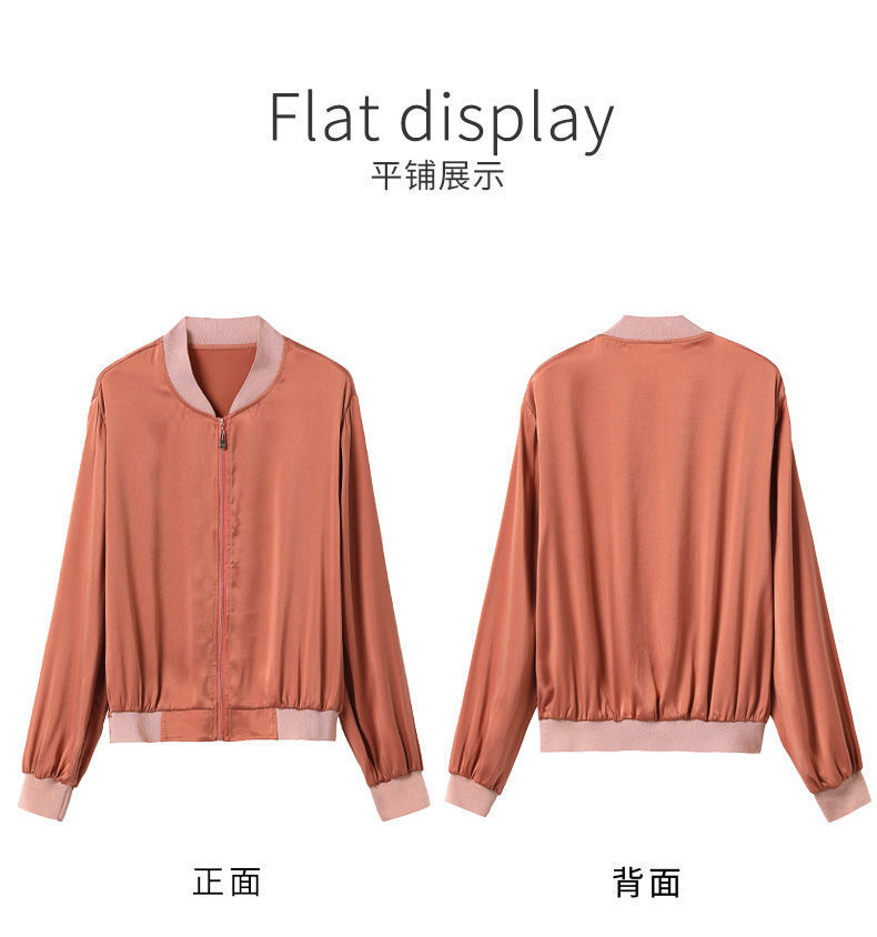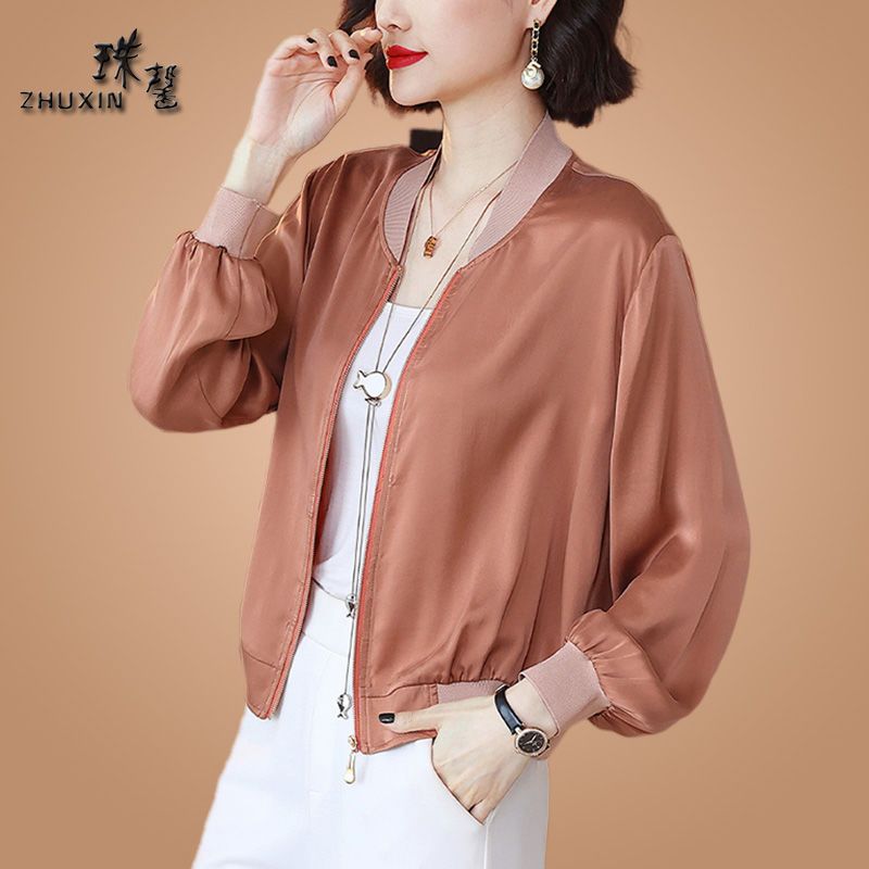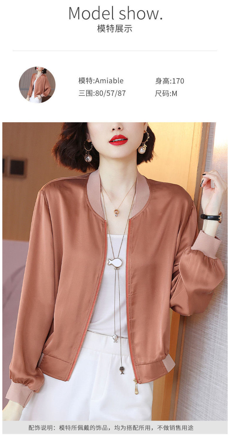 Đồng phục bóng chày lụa tơ tằm màu dâu tằm tơ xuân thu 2022 mới áo khoác dáng rộng dáng ngắn áo khoác ngoài hợp thời trang
