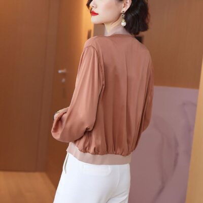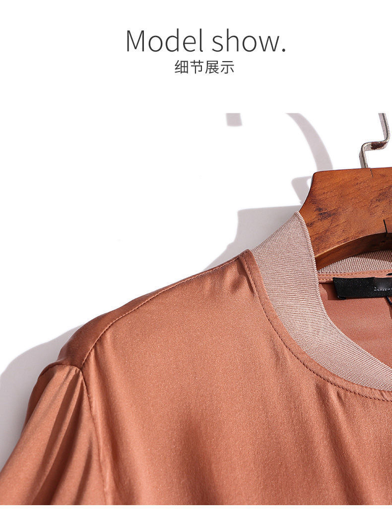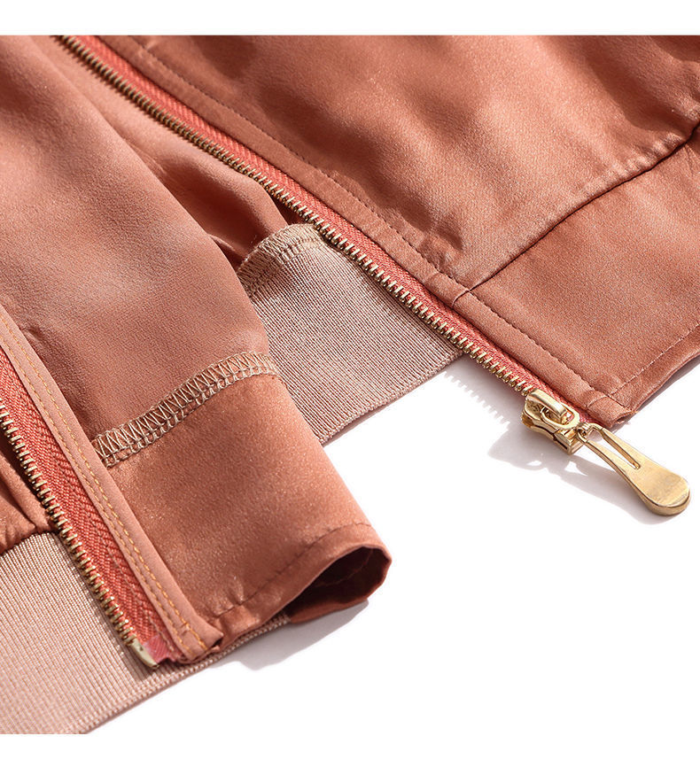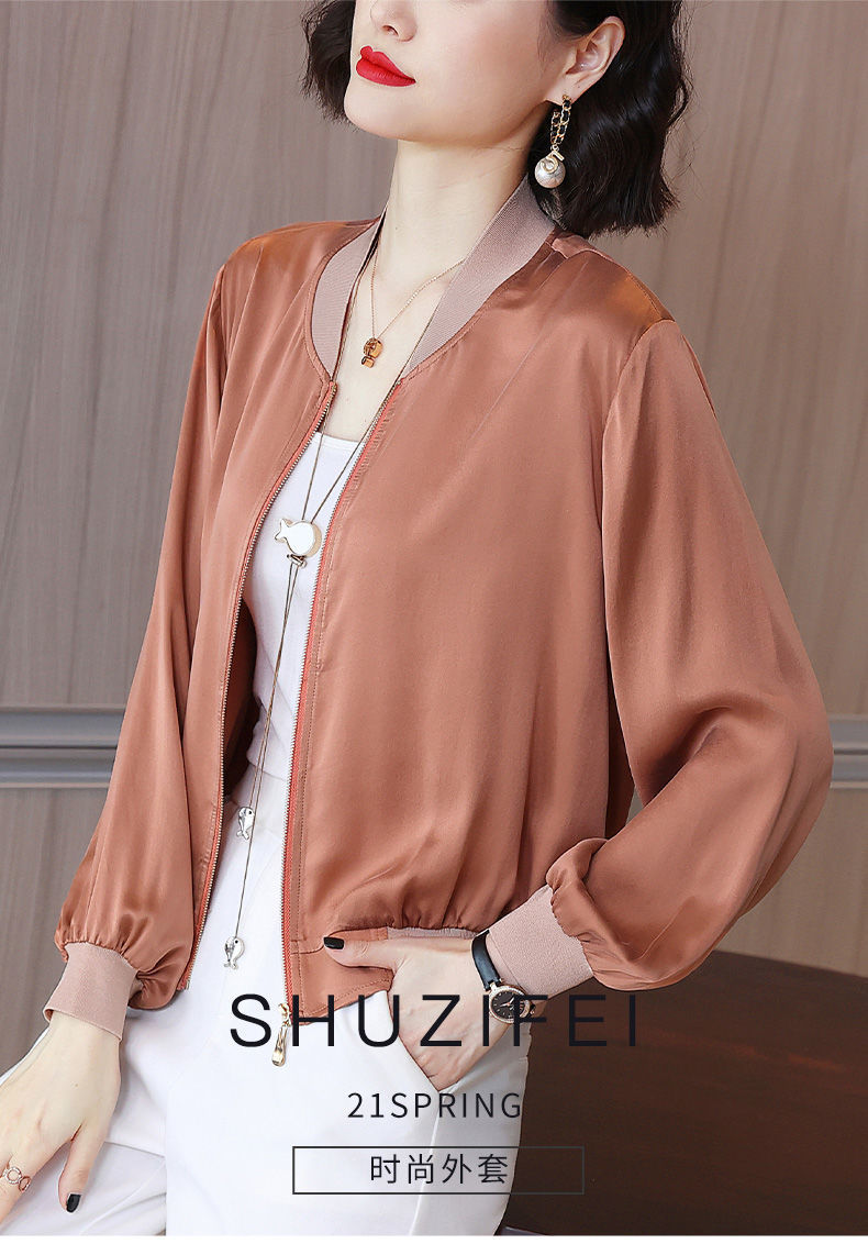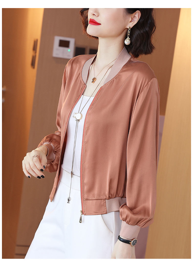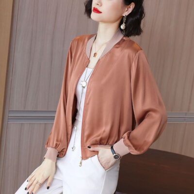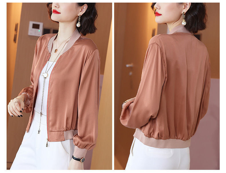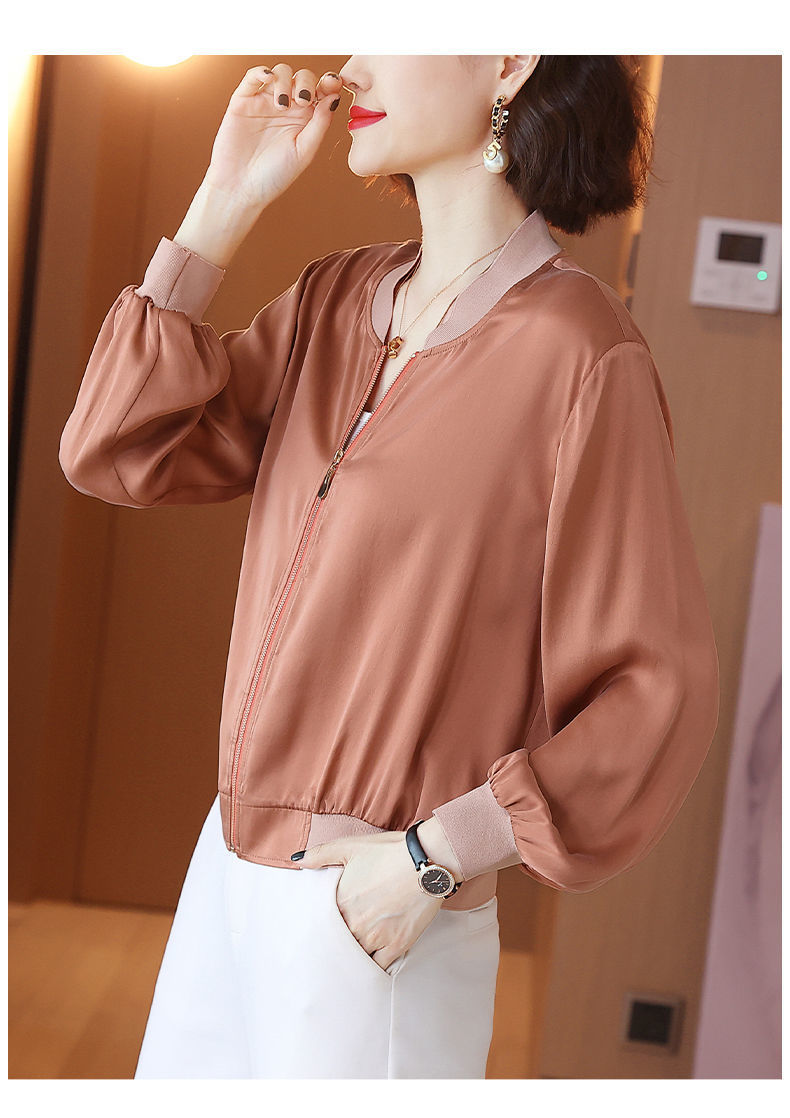 Đồng phục bóng chày lụa tơ tằm màu dâu tằm tơ xuân thu 2022 mới áo khoác dáng rộng dáng ngắn áo khoác ngoài hợp thời trang