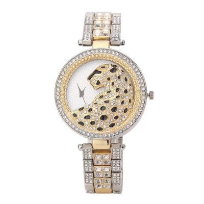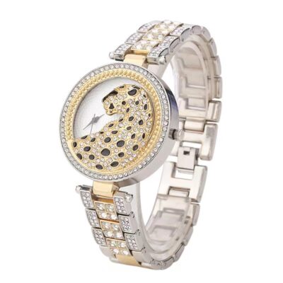 抖音外贸新款钢带镶钻时尚女士手表水钻面豹子豹纹满钻石英表批发