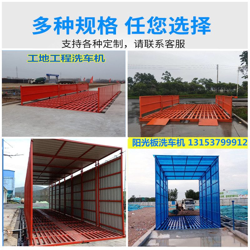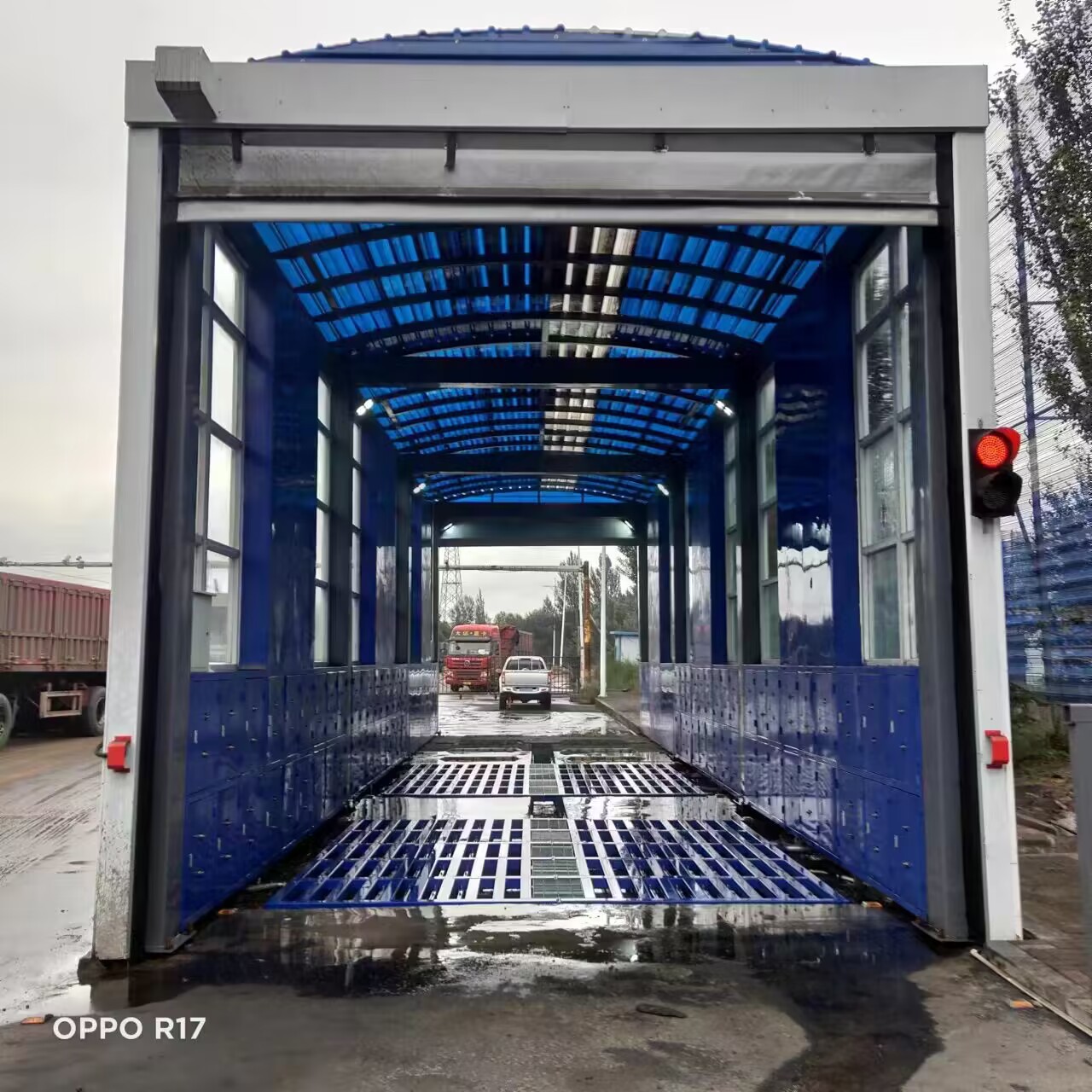 工程车辆洗轮机系统采用无接触对车体进行多角度立体式清洗,能实现冲洗底盘、车辆两侧无接触冲洗。该系统有洗轮机底盘、格栅板、左右侧喷管喷嘴、控制箱、水泵等部分组成。水流通过两侧喷管的喷嘴及底盘喷孔对车身的前后左右上下进行多方位冲洗,车走自动停止冲洗完毕。