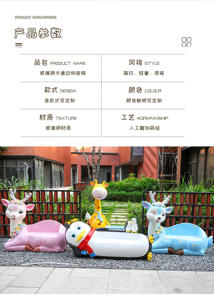 Sản phẩm nổi bật với các đặc điểm: FRP động vật ghế điêu khắc phim hoạt hình ngoài trời đường phố thương mại trung tâm mua sắm sảnh trung tâm bán hàng bộ phận bán hàng trang trí giải trí đồ trang trí