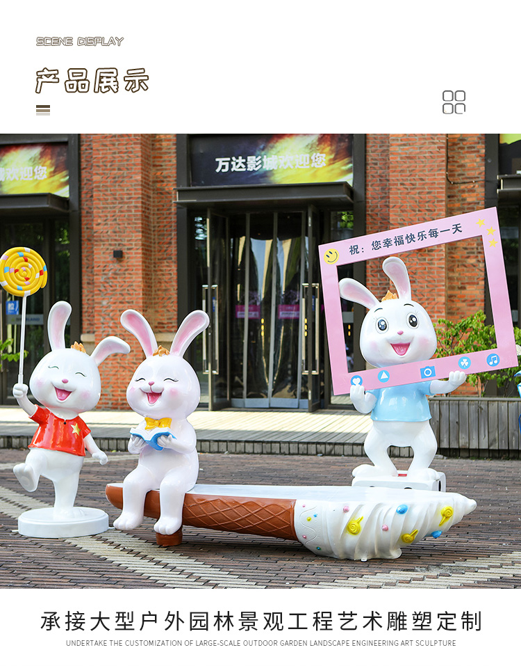 FRP phim hoạt hình động vật thỏ ghế giải trí điêu khắc ngoài trời trung tâm mua sắm trung tâm mua sắm công viên giải trí trang trí nhà trẻ đồ trang trí là lựa chọn lý tưởng cho không gian công cộng, sân vườn hoặc khu đô thị. Sản phẩm giúp nâng cao hình ảnh chuyên nghiệp và sạch đẹp cho môi trường sống.