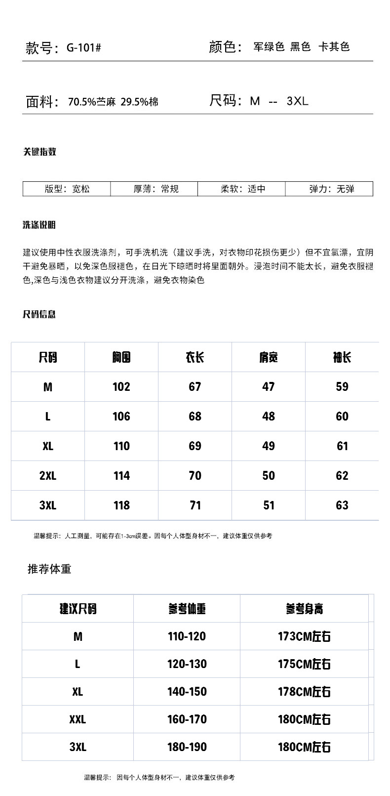 Độ dày: Thông thường Nguồn Loại: Spot Mã sản phẩm: G101 Tên vải: Chất liệu lanh tổng hợp Chức năng: Thoáng khí / Hút ẩm / Hút ẩm Danh mục sản phẩm: Áo khoác Màu sắc: Mơ/Đen/Xanh nhạt/Xanh nhạt Hàm lượng các thành phần vải chính: 70 Kho hàng: Có Thành phần vải chính: Ramie Có báo cáo kiểm tra chất lượng không: Không Phù hợp với đối tượng: Thanh niên Kích thước: M/L/XL/XXL/XXXL/XXXL Phiên bản: Vừa vặn Giới tính áp dụng: Nam Loại hàng tồn kho: Độ tuổi áp dụng cho toàn bộ đơn hàng Phân khúc: Năm/Mùa dành cho người lớn: Mùa xuân 2023 Có mũ trùm đầu hay không: Không có mũ trùm đầu Phong cách: Cơ bản Thiết kế ban đầu của VW Nguồn: Có