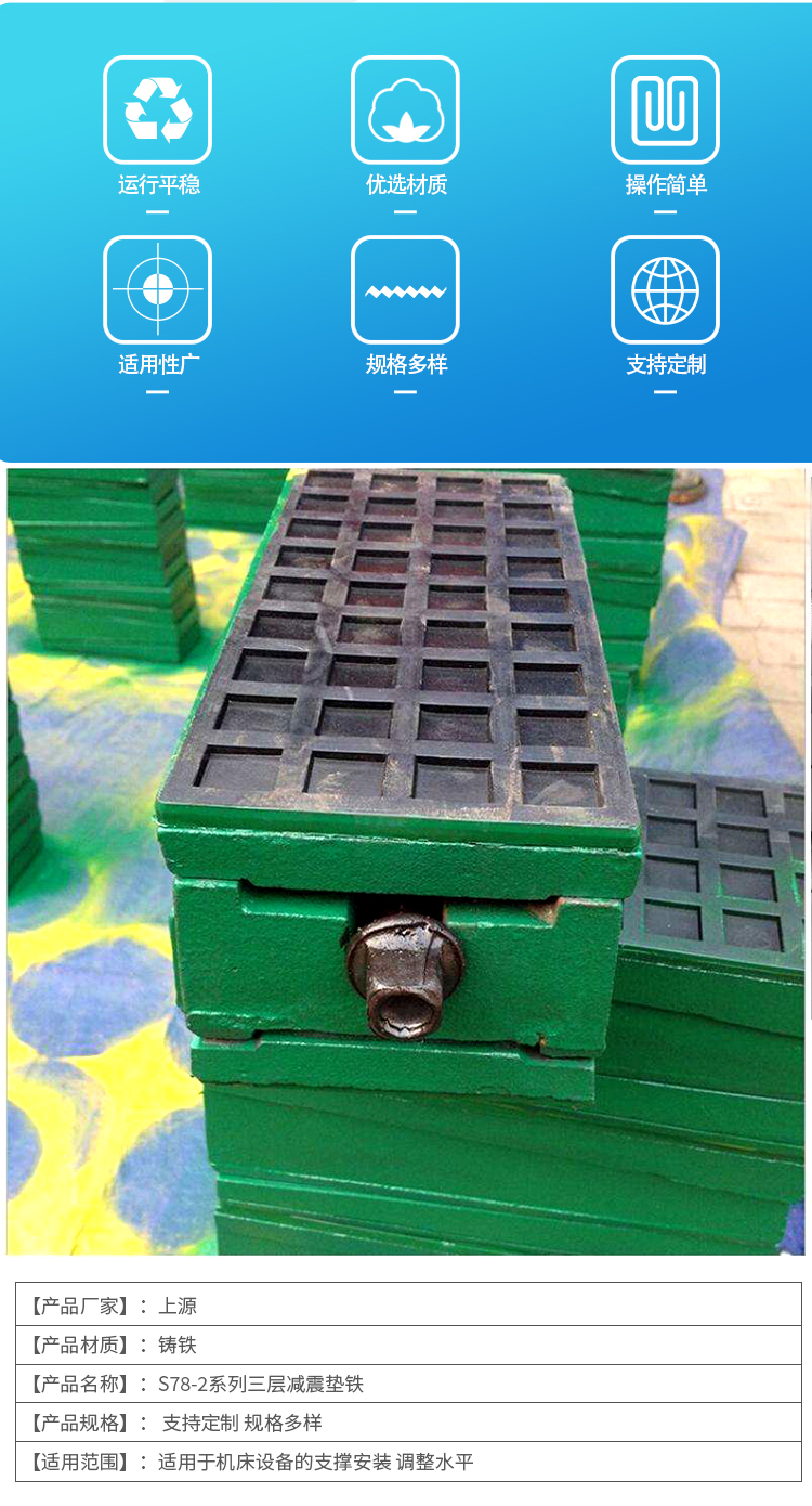 三层防震垫铁性能与特点:安装调整方便,迁移灵活,不用打洞埋设地脚螺丝,不破坏地面,是机床设备安装工艺的一大改革。根据生产变化,随意安排机床位置,使生产流水线柔性化;缩短安装周期,节省安装费用;调整机床水平方便,迅速;减振,降低噪音、耐油性,耐腐蚀性强。