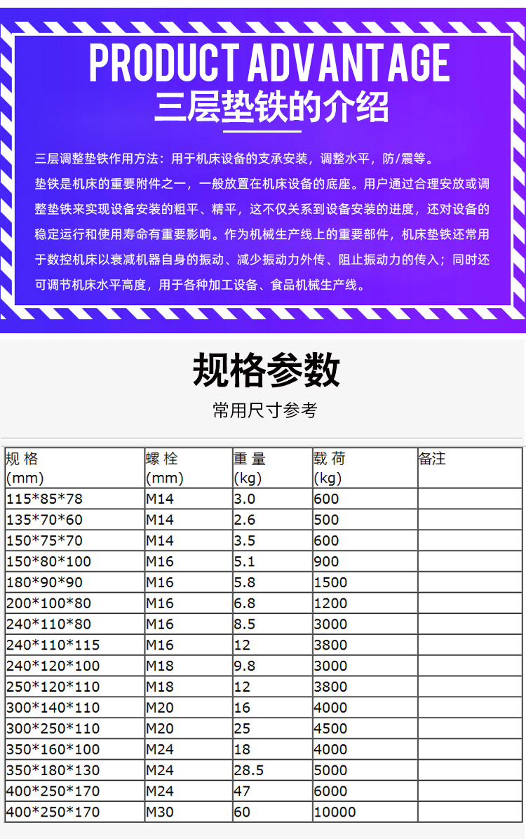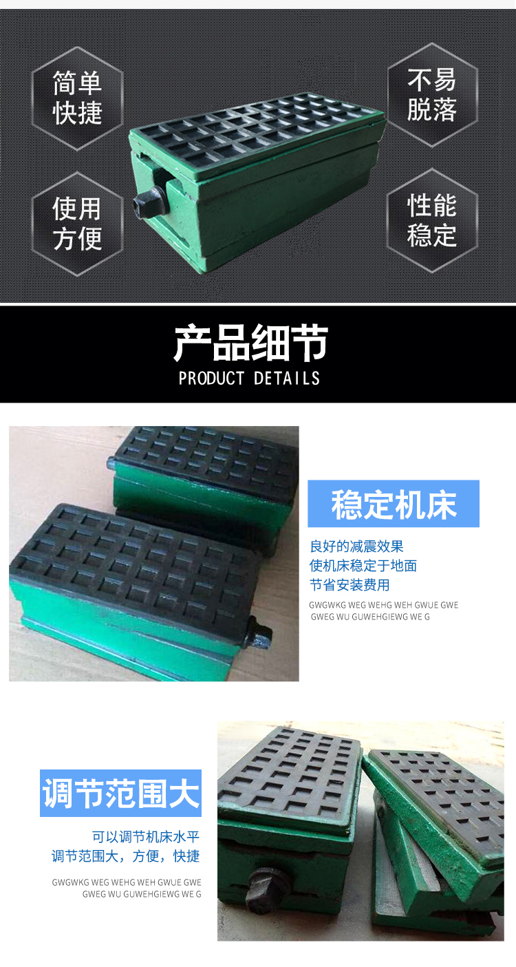 三层防震垫铁使用方法:将垫铁放置于机床下,每个垫铁均受力后,再调整垫铁。可调整高度为5mm 防震垫铁性能与特点:安装调整方便,迁移灵活,不用打洞埋设地脚螺丝,不破坏地面,是机床设备安装工艺的一大改革。