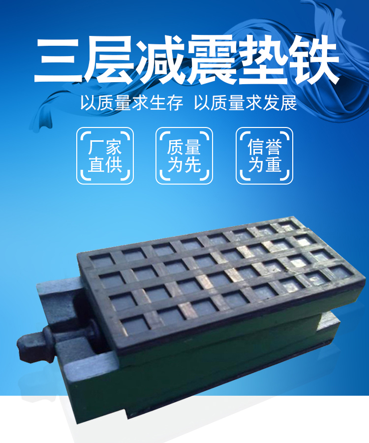 三层减震垫铁造用于机床设备的支承安装,调整水平,产品有固定式和移动式。三层减震垫铁能有效的衰减机器自身的振动,保证加工尺寸精度及质量。安装机床使用机床调整垫铁可以不用设置地脚螺栓与地面固定,良好的减振和相当的垂直挠度,使机床稳定于地面。