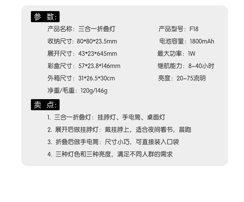 Gấp treo cổ đèn LED đèn đọc sách đèn pin sạc thể thao ngoài trời bảo dưỡng sửa chữa ô tô học tập chiếu sáng. Quý khách có nhu cầu mua Đèn để bàn nhập khẩu vui lòng liên hệ với chúng tôi để được tư vấn hỗ trợ. Dịch vụ mua hàng Trung Quốc sẽ hỗ trợ quý khách mua hàng từ nhà cung cấp và giao tới tận tay quý khách hàng..Mã số sản phẩm: F18 Thương hiệu: FEPIM Cho dù đó là điều khiển thông minh: Không Chế độ chuyển đổi: Loại nút Màu sắc: Đen/hồng/hồng Phương thức cấp nguồn: Pin lithium tích hợp Phương pháp xử lý: LOGO OEM Loại bằng sáng chế: Bằng sáng chế mô hình tiện ích Liệu có bằng sáng chế: Có Chứng nhận: Chứng nhận EU CE chỉ số hoàn màu: 80-89 Số bằng sáng chế: ZL 2023 2 1197621.4 Nền tảng hạ nguồn chính: ebay/Amazon/wish/AliExpress/LAZADA/LAZADA Có các thương hiệu tư nhân được ủy quyền: Không Chiếu sáng: Nói chung là ánh sáng cơ bản Người: Có Chất liệu chao đèn: nhựa Chức năng bổ sung: đèn ngủ/đèn học/đèn học Điện áp: ≤36V Có dành riêng cho xuất khẩu xuyên biên giới không?Nguồn cung cấp: có Số chứng chỉ: PTC23092211403 Kiểu dáng: hiện đại và đơn giản Khu vực bán hàng chính : Châu Âu/Nam Mỹ/Bắc Mỹ/Bắc Mỹ