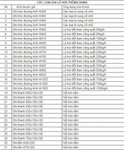 Bảng một số mẫu ghi lò hơi thông dụng trên thị trường hiện nay:
