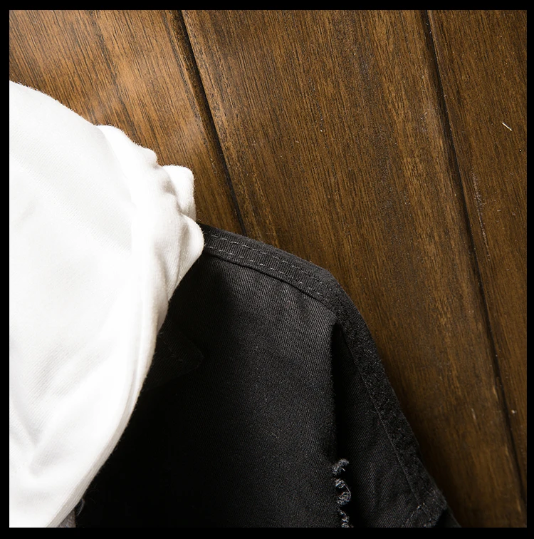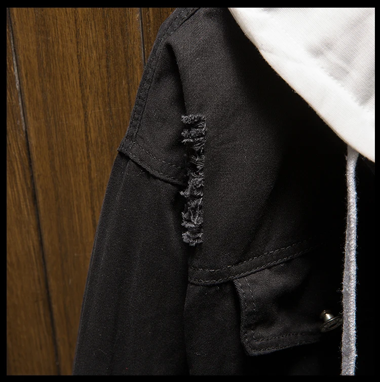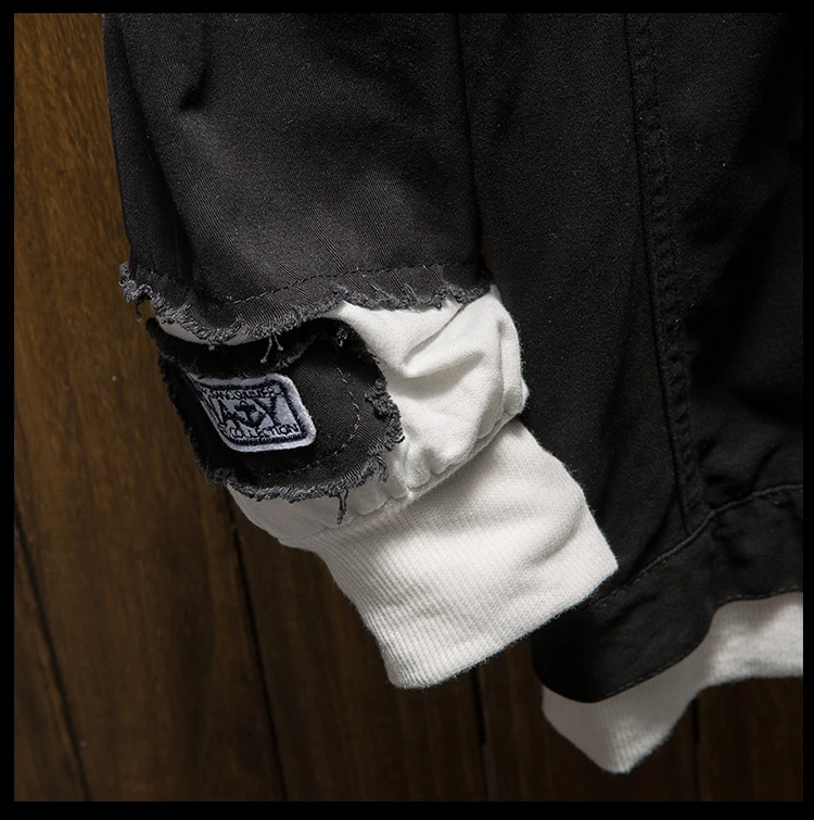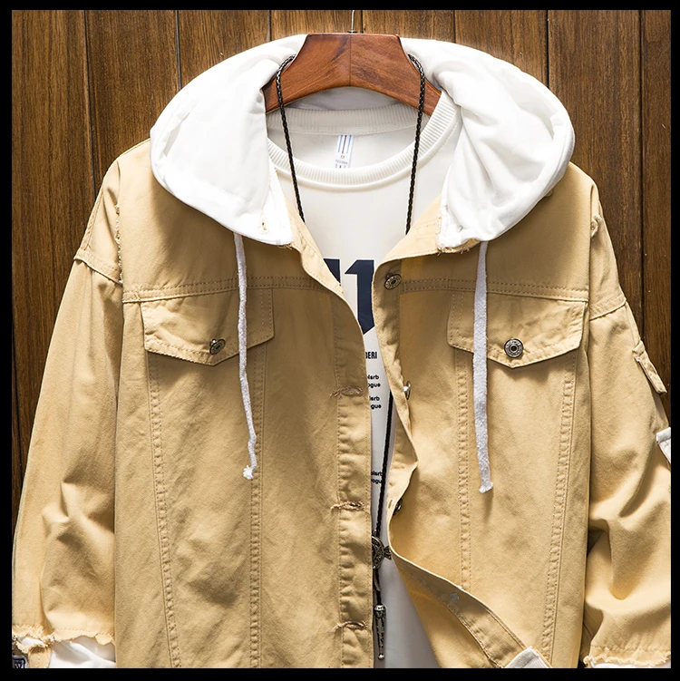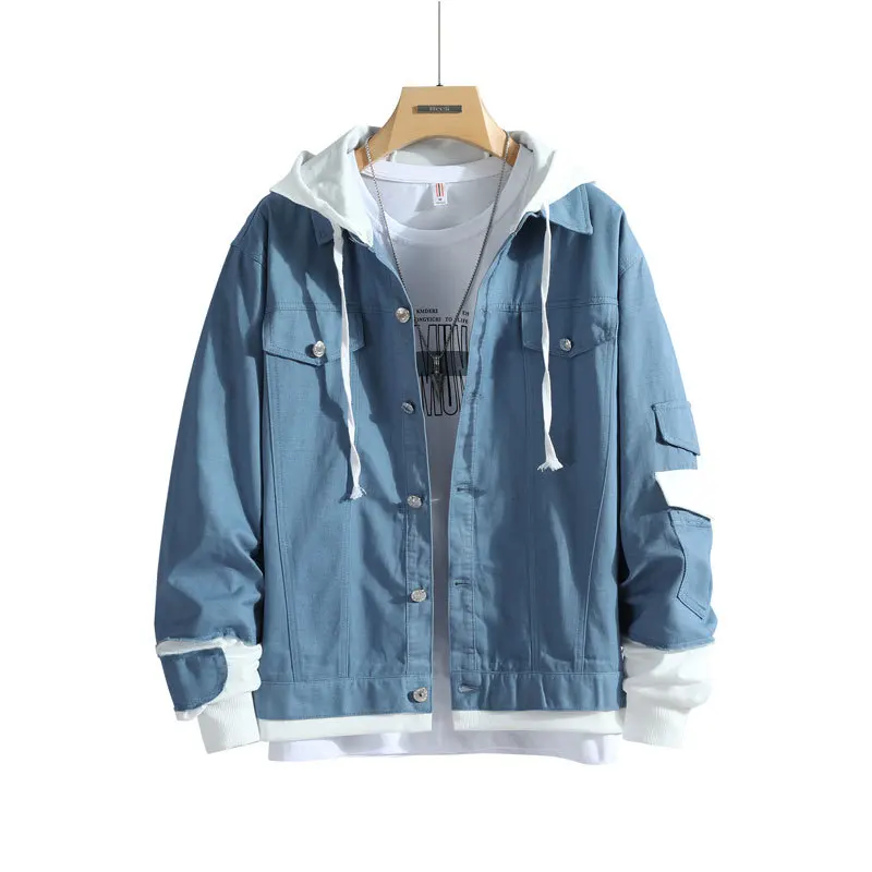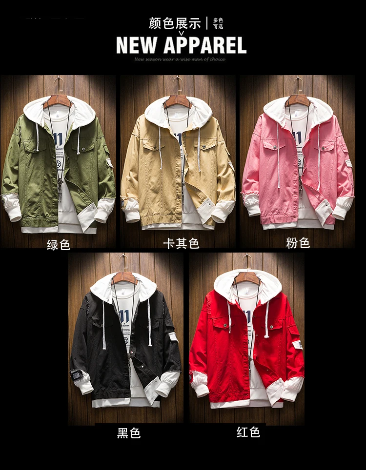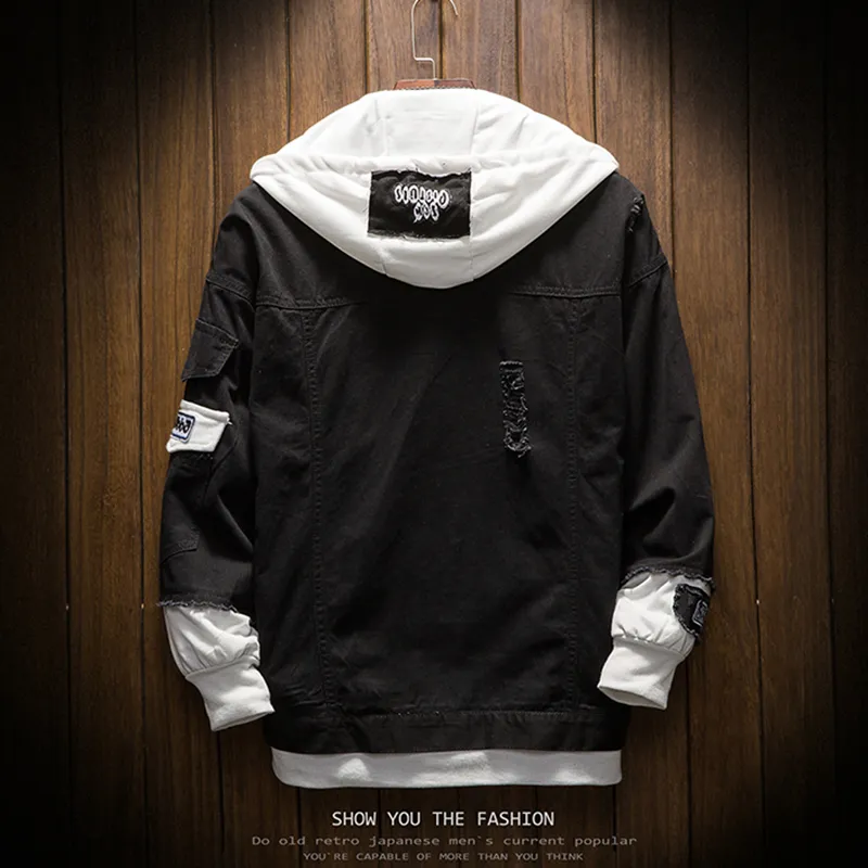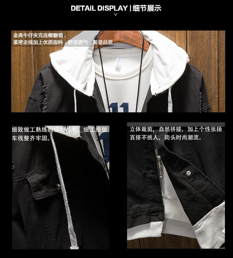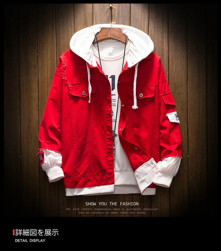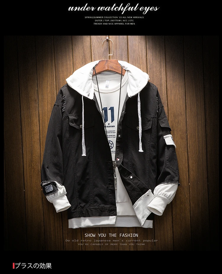 Giả Hai Mảnh Có Mũ Trùm Đầu Nam Denim Áo Khoác Nam Thu Xuân Mới Khâu Hồng Đen Áo Khoác Jean Nam Áo Khoác Denim Áo Khoác Nam