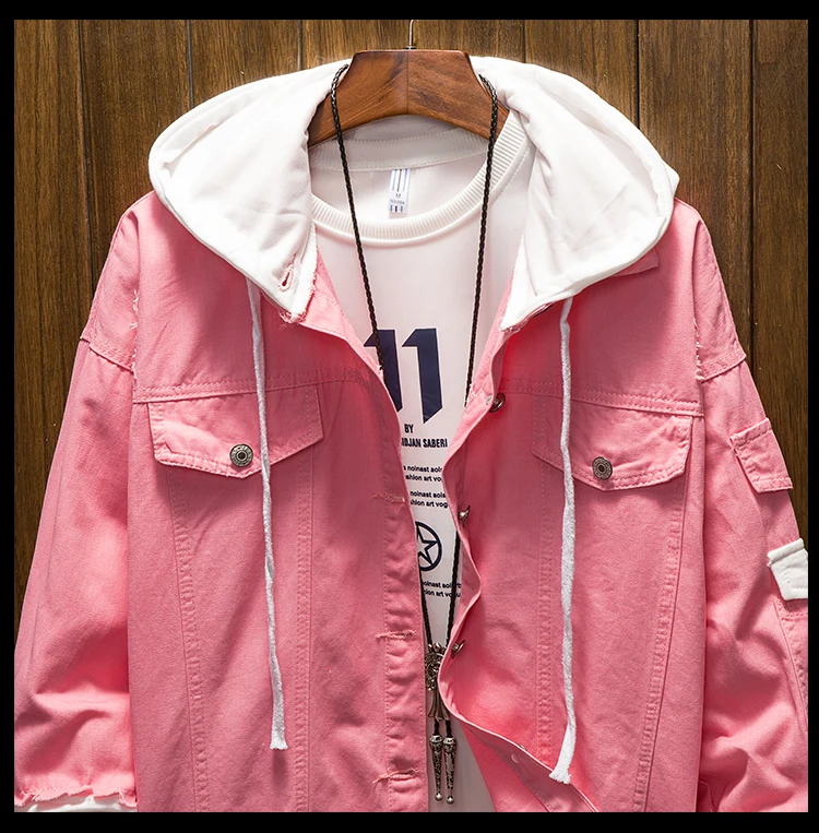 Fake Two Pieces Hooded Mens Denim Jacket Men Spring Autumn New Stitching Pink Black Jean Jacket Men Denim Jackets Coats