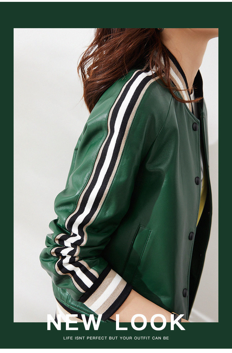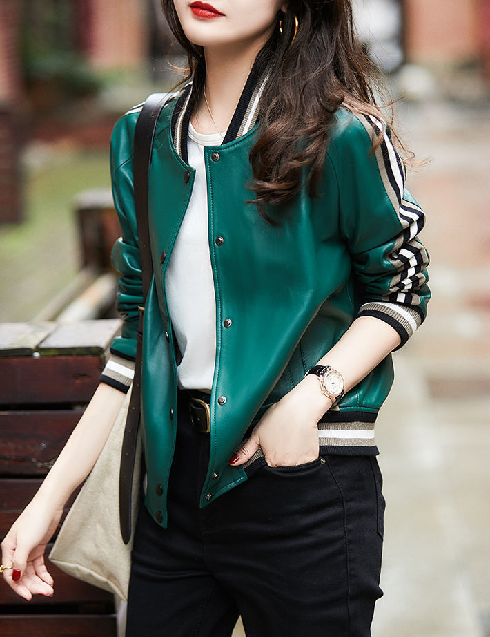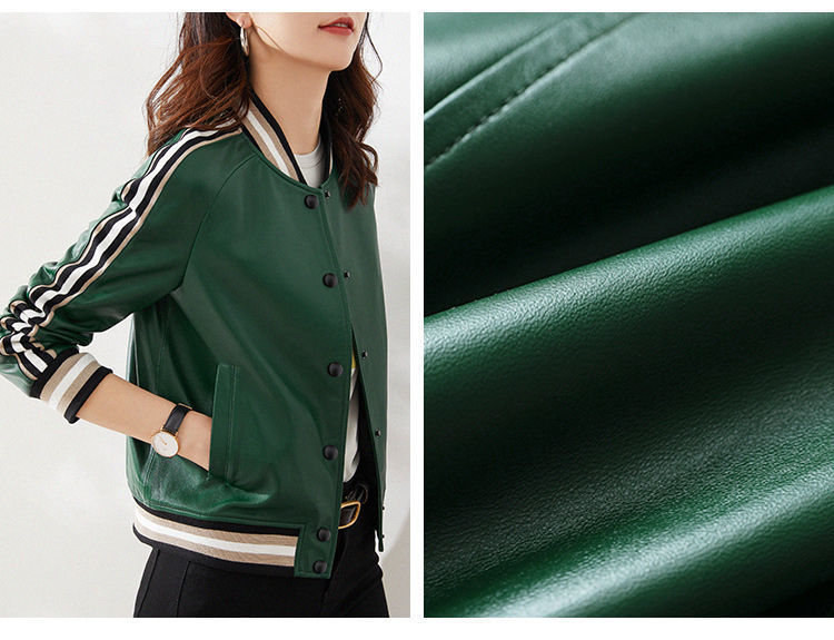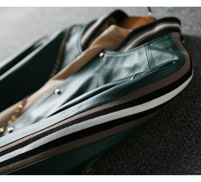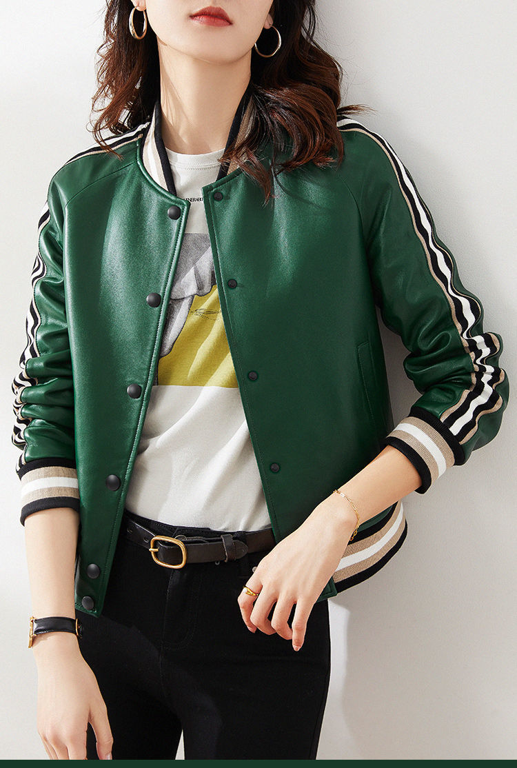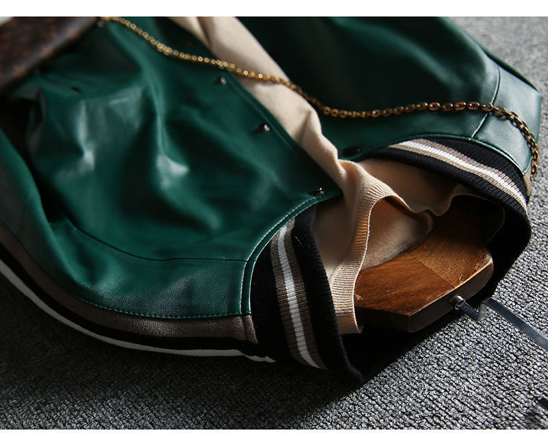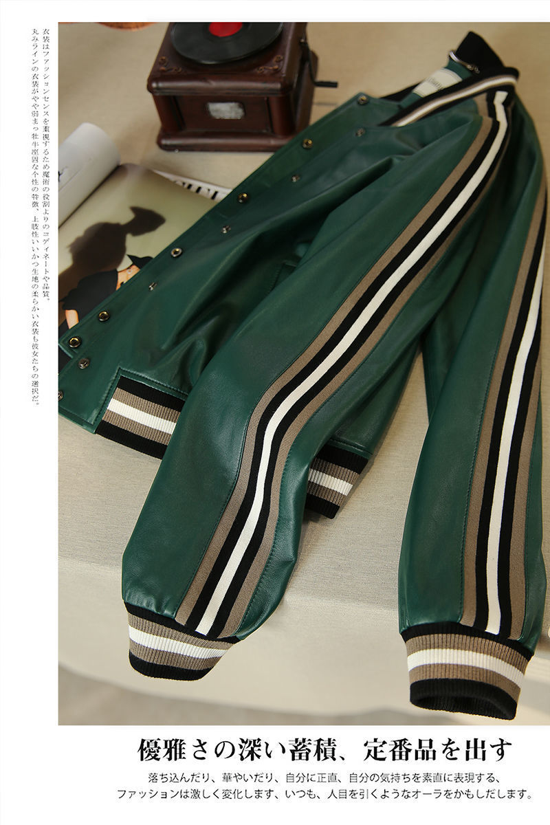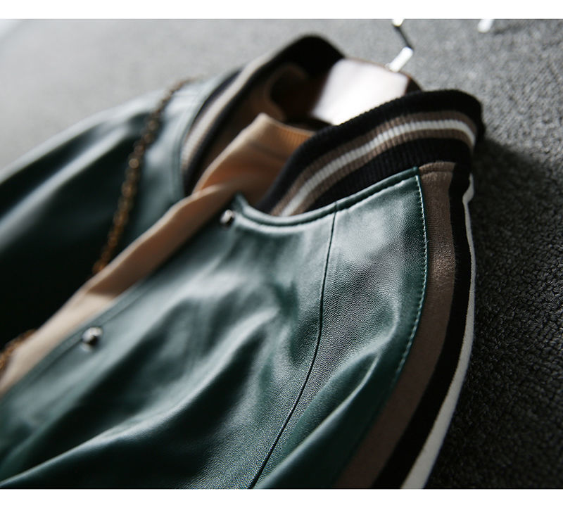 Giành chiến thắng vào đầu mùa thu Đẹp trai và gọn gàng màu xanh lá cây giả da cừu áo khoác bóng chày ngắn áo khoác da phụ nữ trông gầy