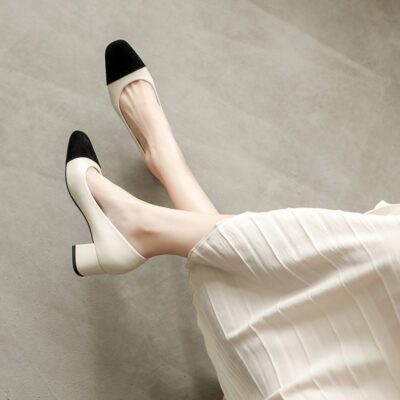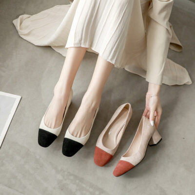Giày cao gót cỡ trung dành cho nữ mùa xuân 2023 giày công sở dày gót lưới màu đỏ thoải mái da bò mũi tròn giày thường