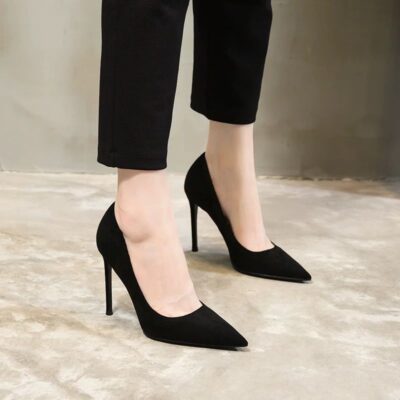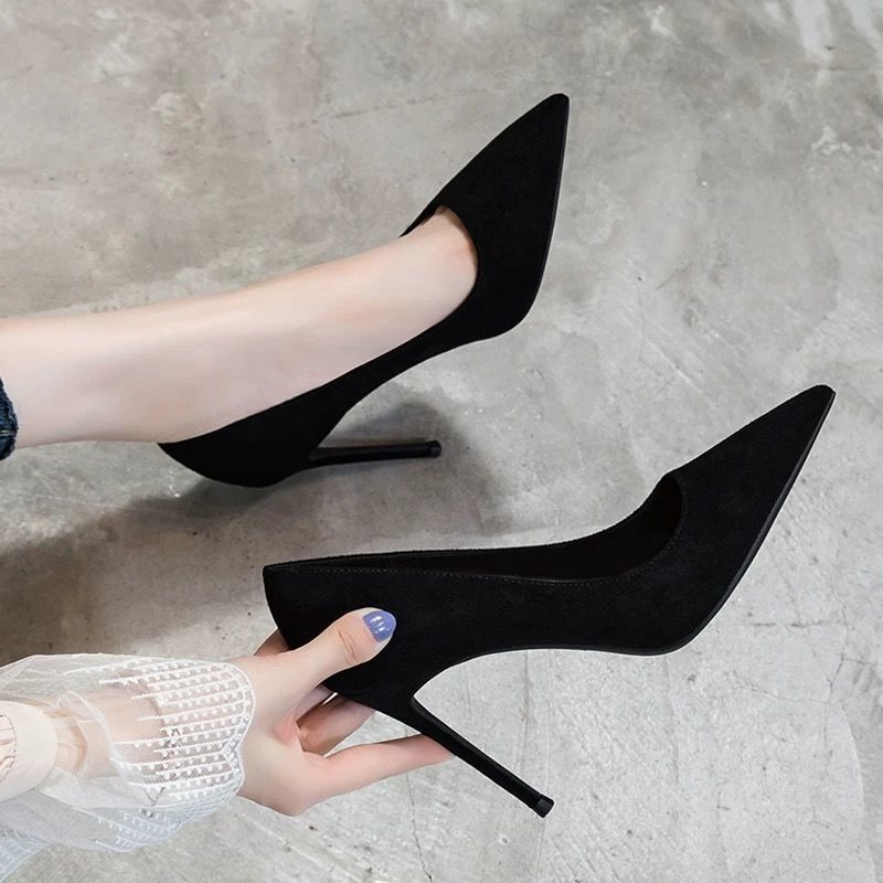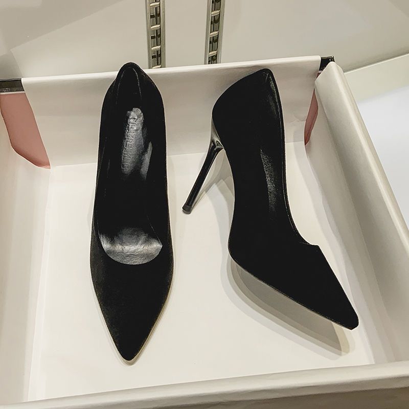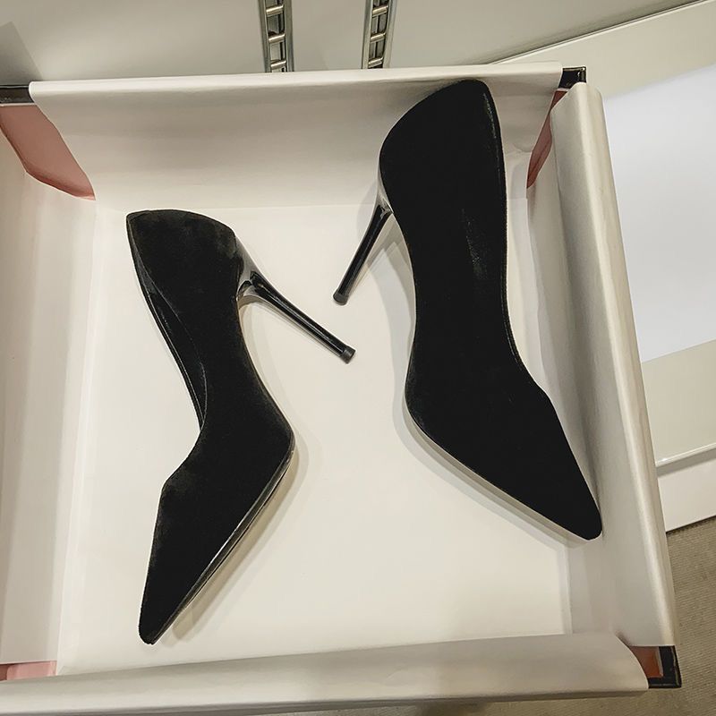Giày cao gót da lộn màu đen giày nghi thức nữ 2023 5cm phù hợp với tất cả các trận đấu giày mũi nhọn giày công sở chính thức 7c