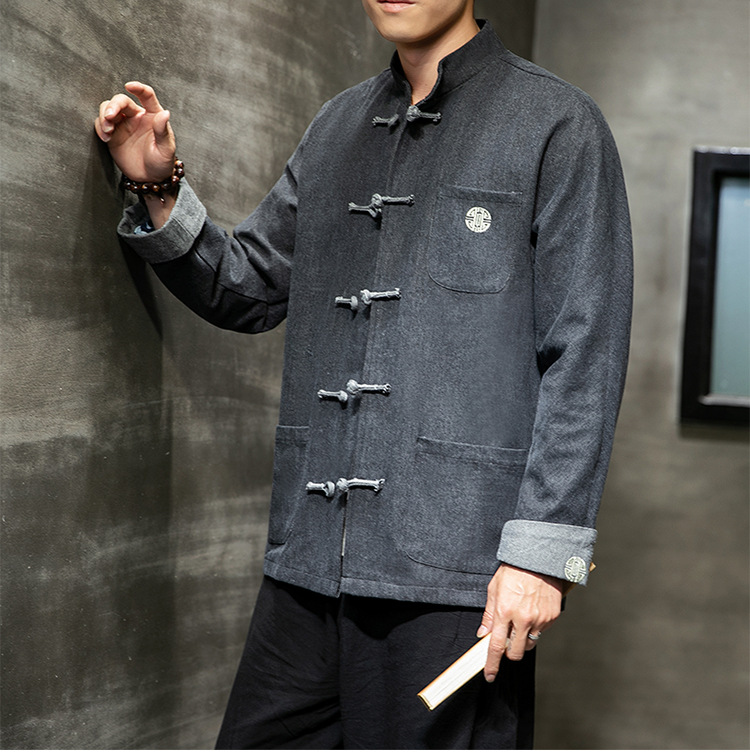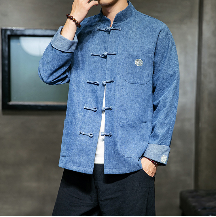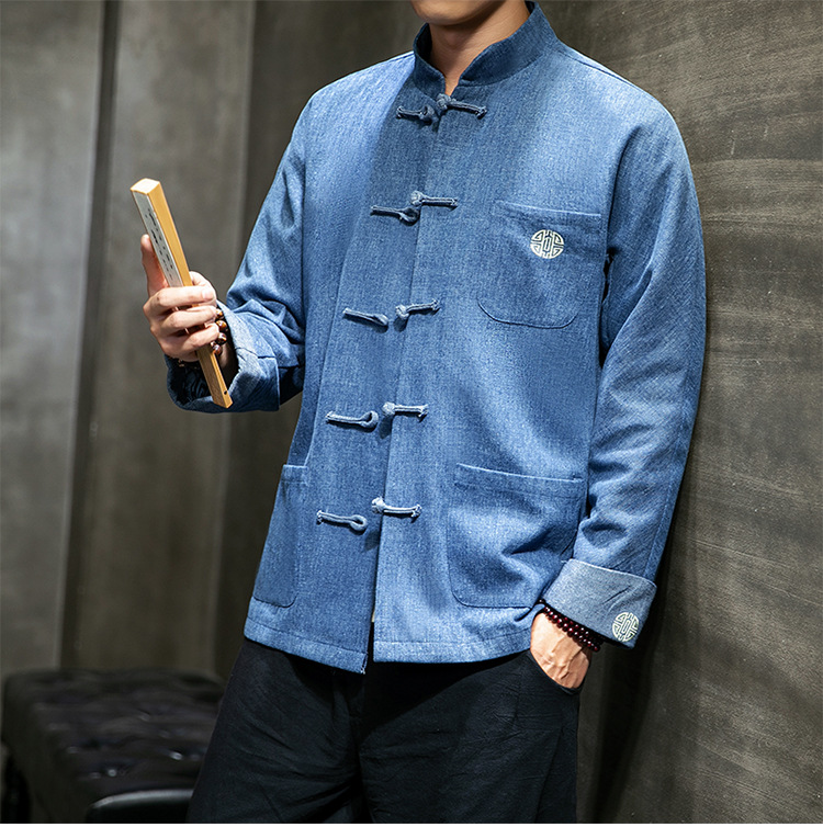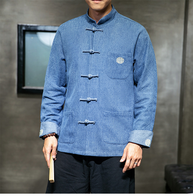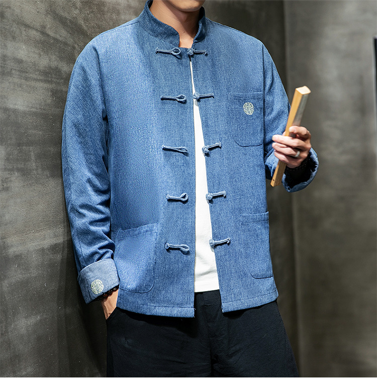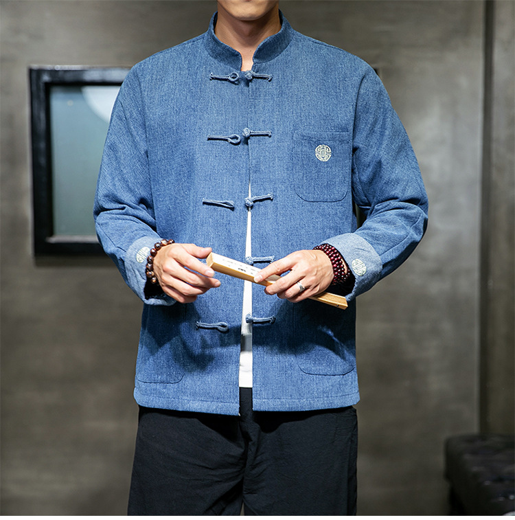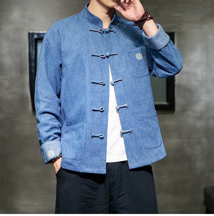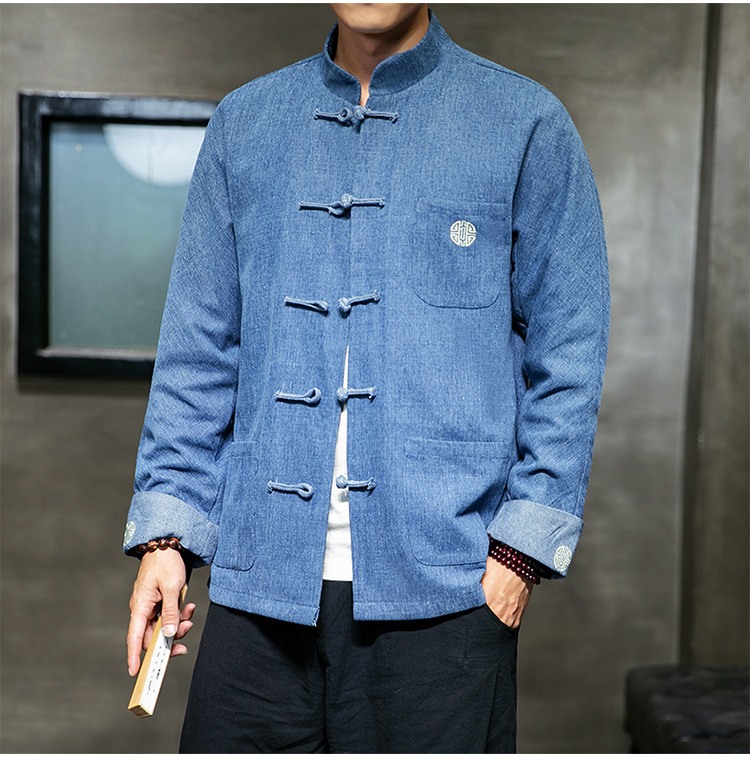 Gió Trung Quốc Mùa Xuân Nam Khóa Cổ Áo Khoác Áo Khoác Thanh Niên Size Lớn Dân Tộc Denim Thêu Áo Khoác Cao Cấp