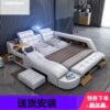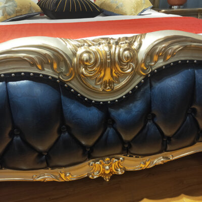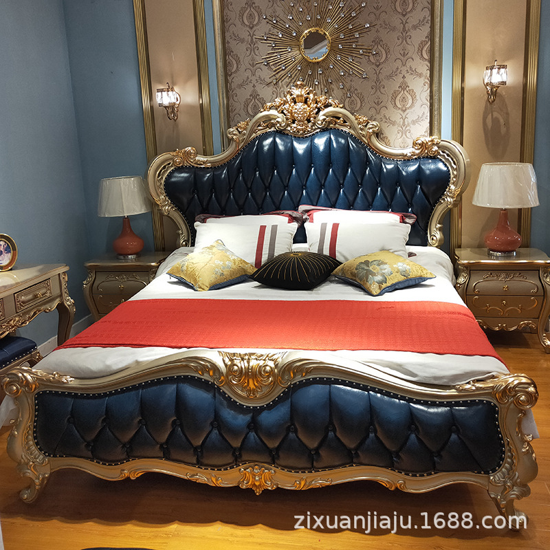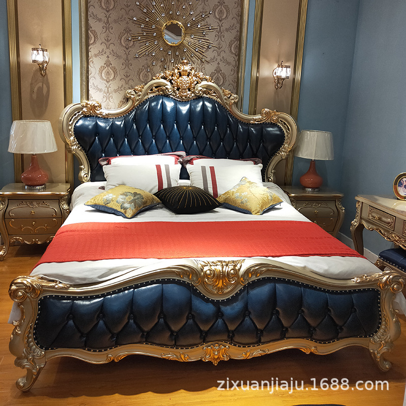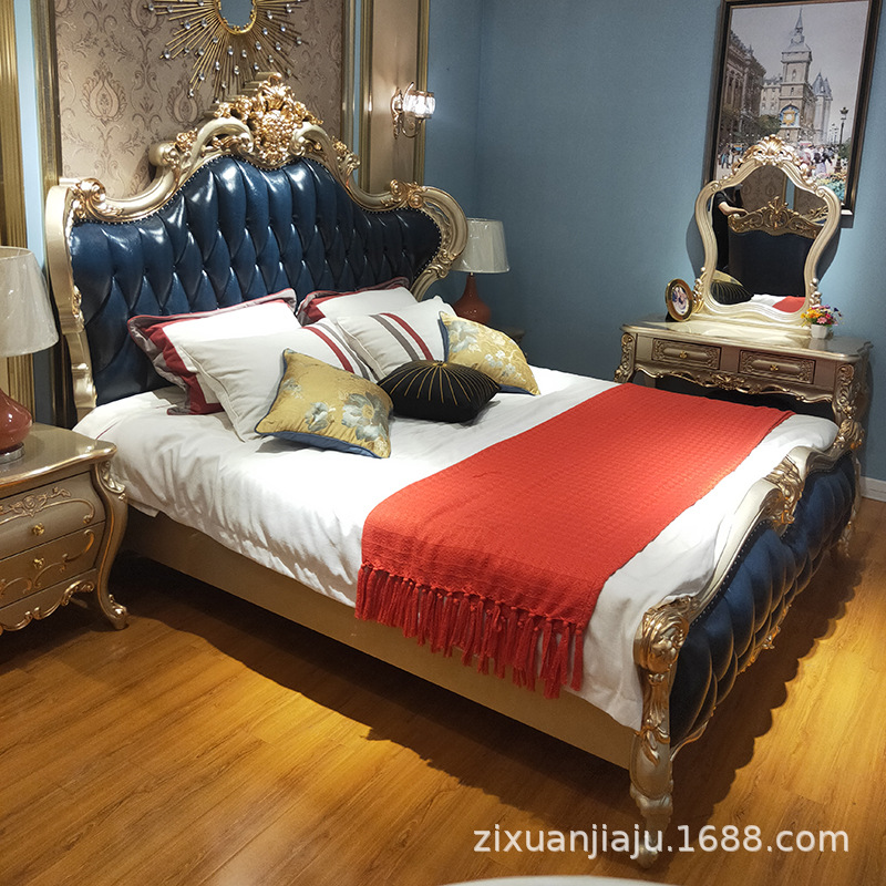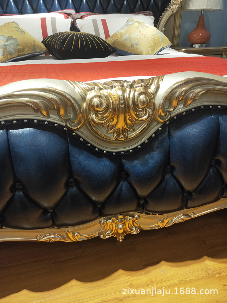 Giường da cao cấp phong cách Châu Âu chạm khắc gỗ nguyên khối nhập khẩu da bò lớp 1 màu vàng sâm panh Giường master cao cấp 1,8 mét
