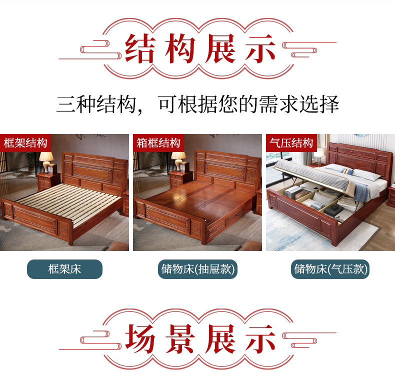 Giường gỗ cứng bằng gỗ cẩm lai vàng 1,8m giường đôi lưu trữ đồ nội thất phòng ngủ chính bằng gỗ gụ cổ điển nhà Minh và nhà Thanh giả