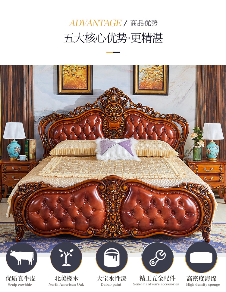 Giường ngủ gỗ nguyên khối phong cách châu Âu giường đôi 1,8m giường công chúa bọc da Mỹ phòng ngủ chính giường cưới chạm khắc nội thất biệt thự
