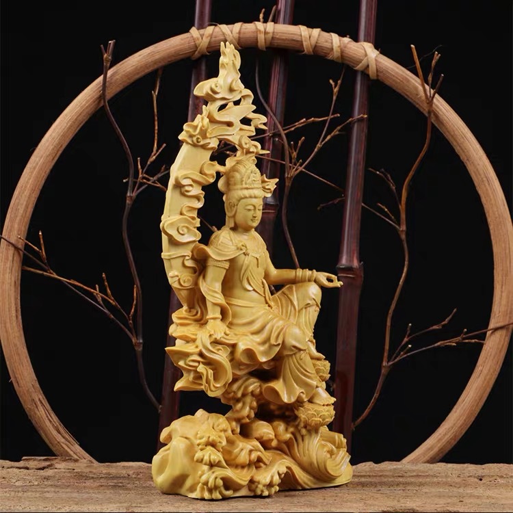 Gỗ hoàng dương chạm khắc Mặt trăng nước Quán Thế Âm Bồ Tát trang trí gỗ nguyên khối Tượng Phật Quán Thế Âm cất giữ thủ công khắc Wenwan bộ sưu tập