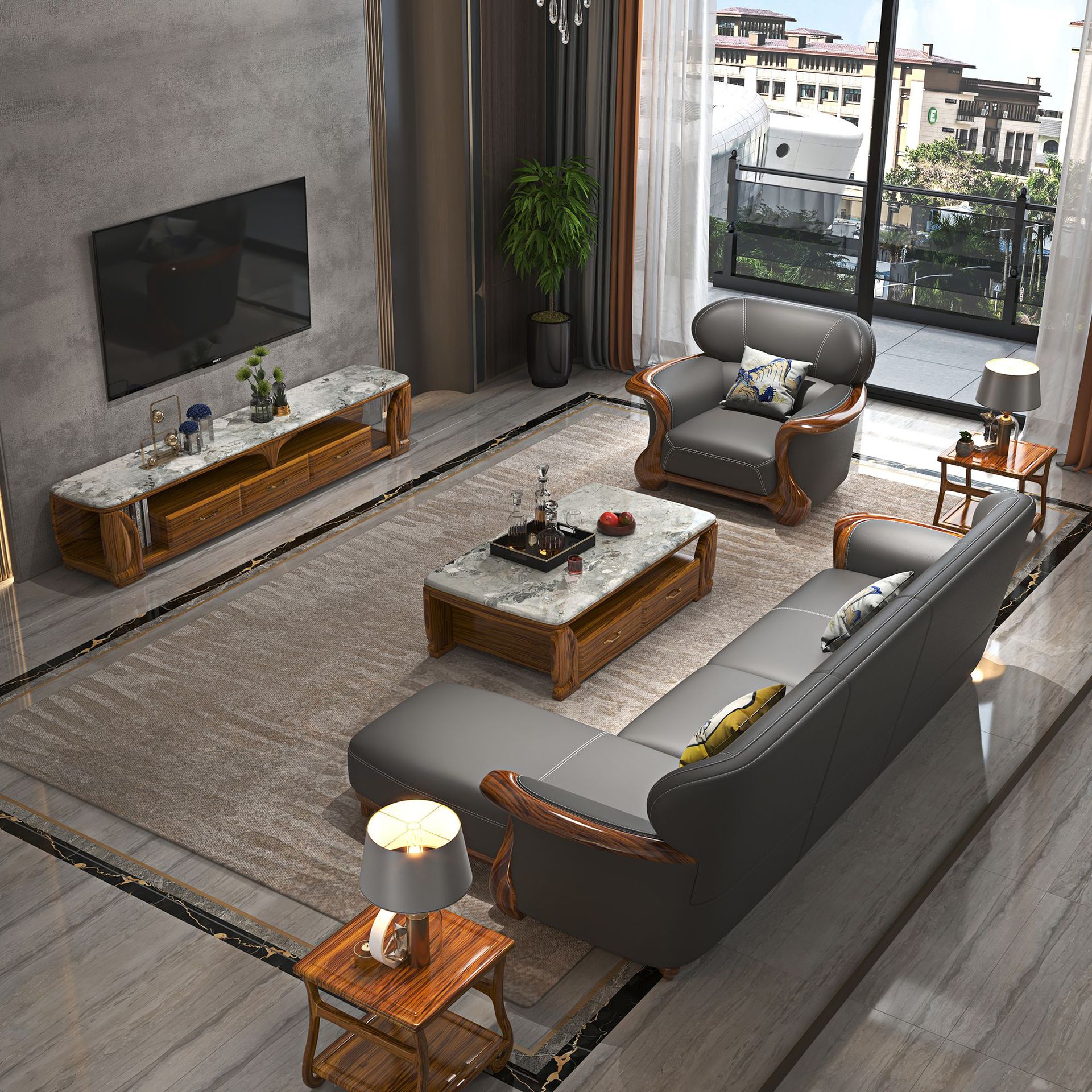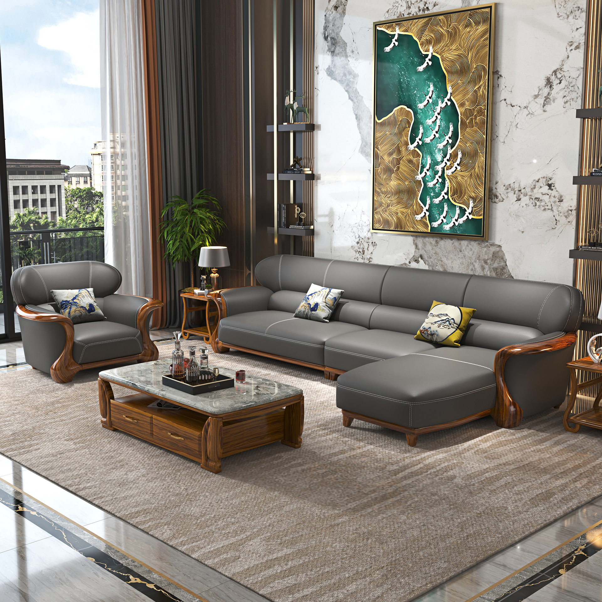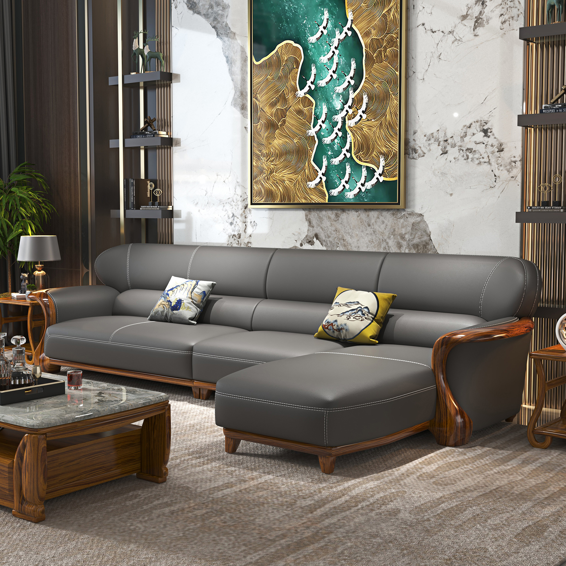 Gỗ mun hiện đại da góc Chaise longue sofa Bắc Âu phòng khách gỗ nguyên khối mới phong cách Trung Hoa Sofa da đầu hình chữ L