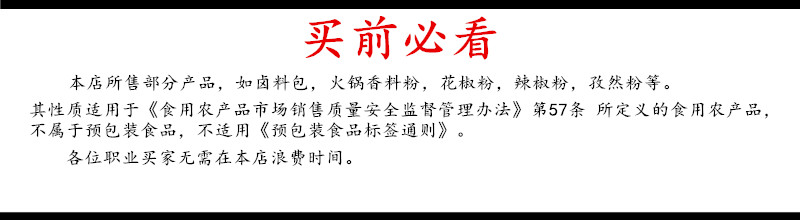累计买满100斤此款卤料,免费送此款卤料的香料配方。只要买满100斤,毫无保留的赠送给您。您可以凭此配方,自行到你们当地购买各种香料进行配置。