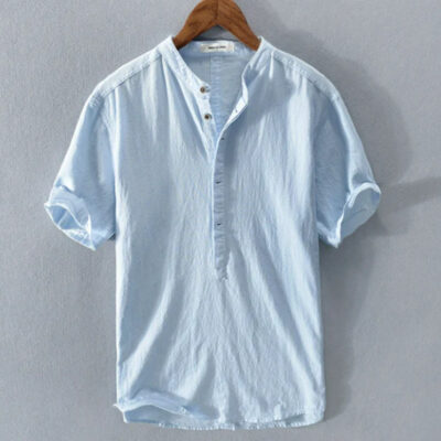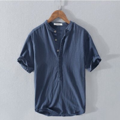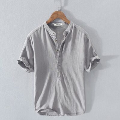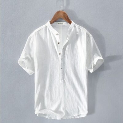 Guochao Đơn Giản Màu Trơn Áo Sơ Mi Nam Vải Lanh Cotton Dáng Rộng Cổ Đứng Áo Sơ Mi Tay Ngắn