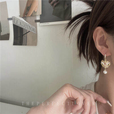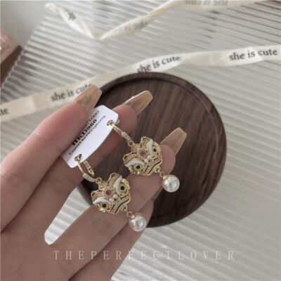 Guofeng Retro Awakening Sư Tử Mặt Dây Chuyền Ngọc Trai Bông Tai Tính Khí Thiết Kế Bông Tai Zircon Siêu Khảm 2023 Bông Tai Mới
