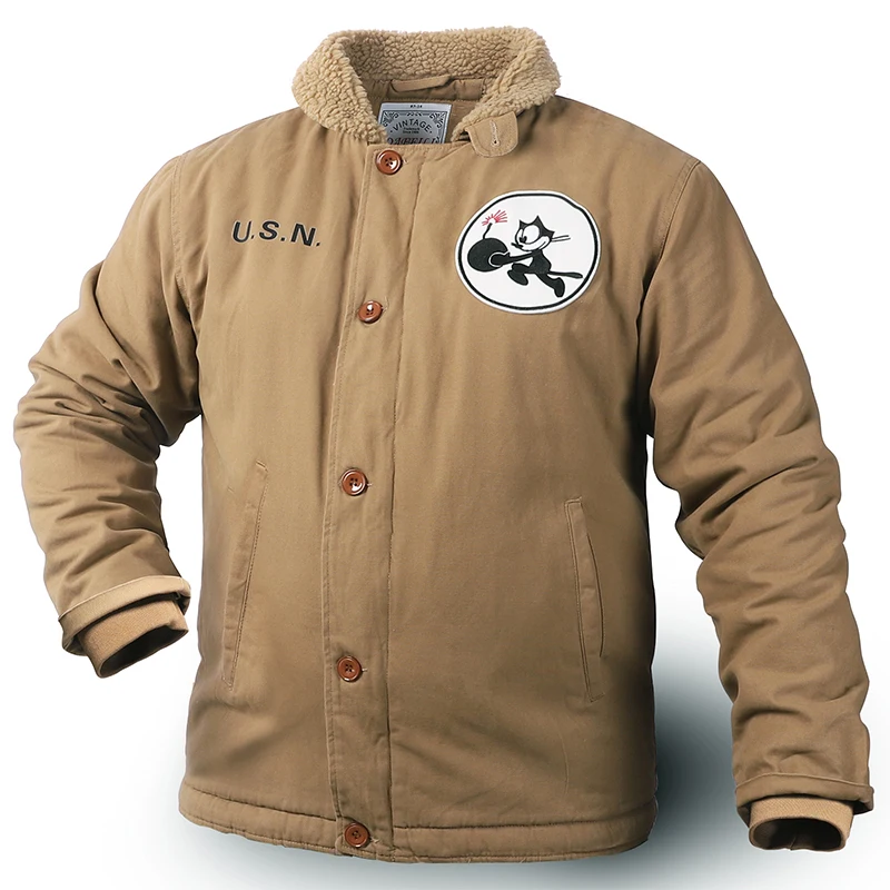 In 1943, the first N1 Deck Jacket was introduced. . Loved by sailors the jacket was warmer, more functional and durable than its predecessors. Firstly made in a dark blue/black it was soon replaced by a khaki/greenish tone for better camouflaging purposes at beaches.