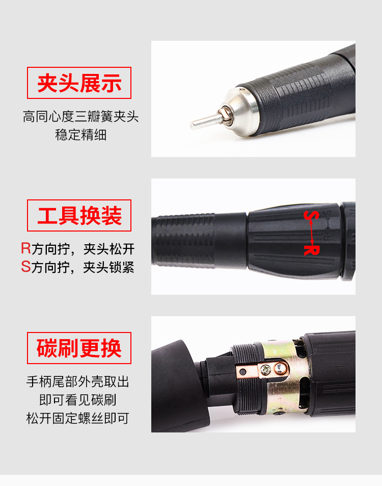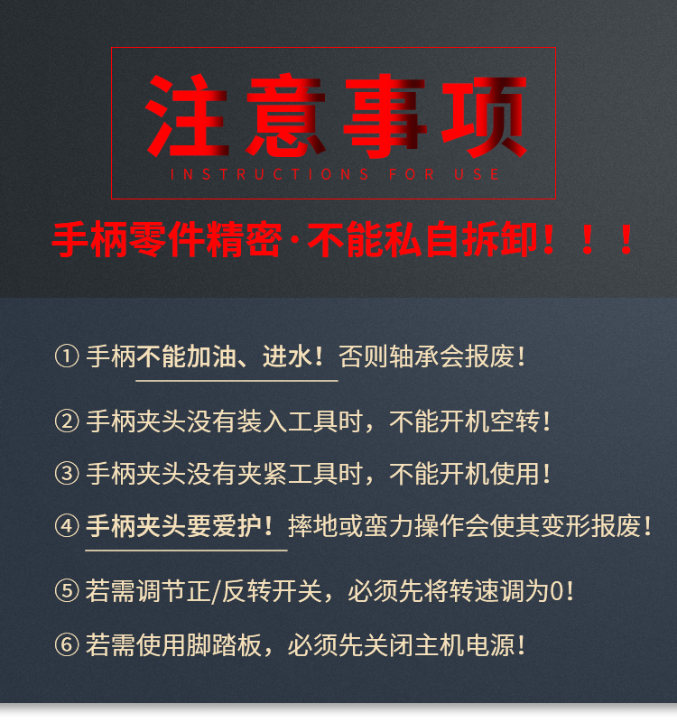 一、新装工具时,先调试工具是否跳动,如果跳动,请把夹头松开,把工具顺时针旋转半圈或把工具伸出或缩进一点,如果还是跳动,请更换工具,直至工具平稳(注:电子机手柄严禁敲打)。