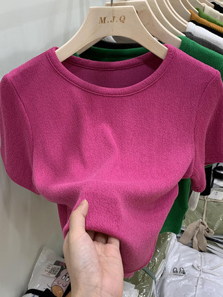 Hàng Châu Âu mùa hè áo thun nữ tay ngắn solid color áo thun ôm nửa tay tinh khiết ham muốn hot girl short sang trọng top in triều