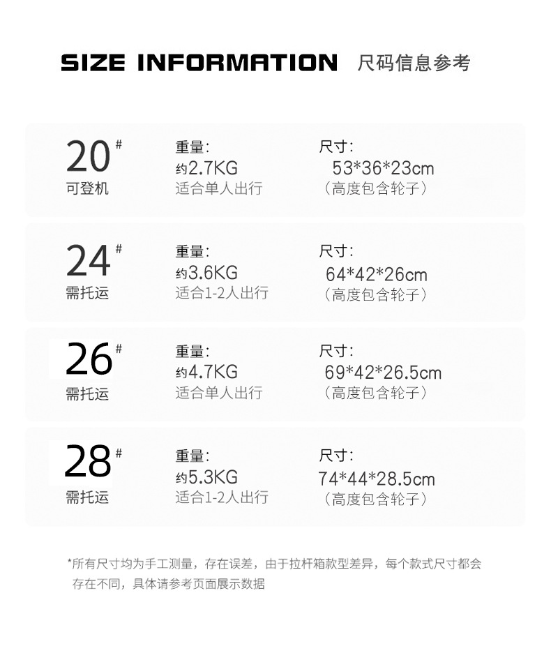 Giới tính áp dụng: Unisex / Nam và Nữ Hoa văn: Màu đồng nhất Số sản phẩm: 919 Năm niêm yết Mùa: Mùa đông 2022 Cảnh áp dụng: Du lịch Giải trí Chức năng: Chống nước Màu sắc: Trắng sữa/Hồng hoa anh đào/Xanh lá cây Matcha/Xám nhạt/Cà phê/Vàng nhạt/Ánh sáng Màu vàng Chất liệu: PC Kích thước: 20″/24″/26″/28″/28″ Phương thức mở: Dây kéo Model: 919 Kiểu con lăn: bánh xe thông dụng