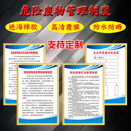 - 颜色分类: WFZD01危险废物管理制度(PVC板) WFZD02危险废物转移联单管理制度(PVC板) WFZD03危险废物管理岗位责任制度(PVC板) WFZD04危险废物台账管理制度(PVC板) WFZD05危险废物贮运管理制度(PVC板) WFZD06危险废物岗位劳动保护管理制度(PVC板) WFZD07危险废物应急预案备案制度(PVC板) WFZD08企业环保组织机构图(PVC板) 危险废物制度(1套8张KT板包金边) 危险废物制度(1套8张KT板包银边) 危险废物制度(1套8张贴纸) 定制专拍 联系客服报价拍总金额