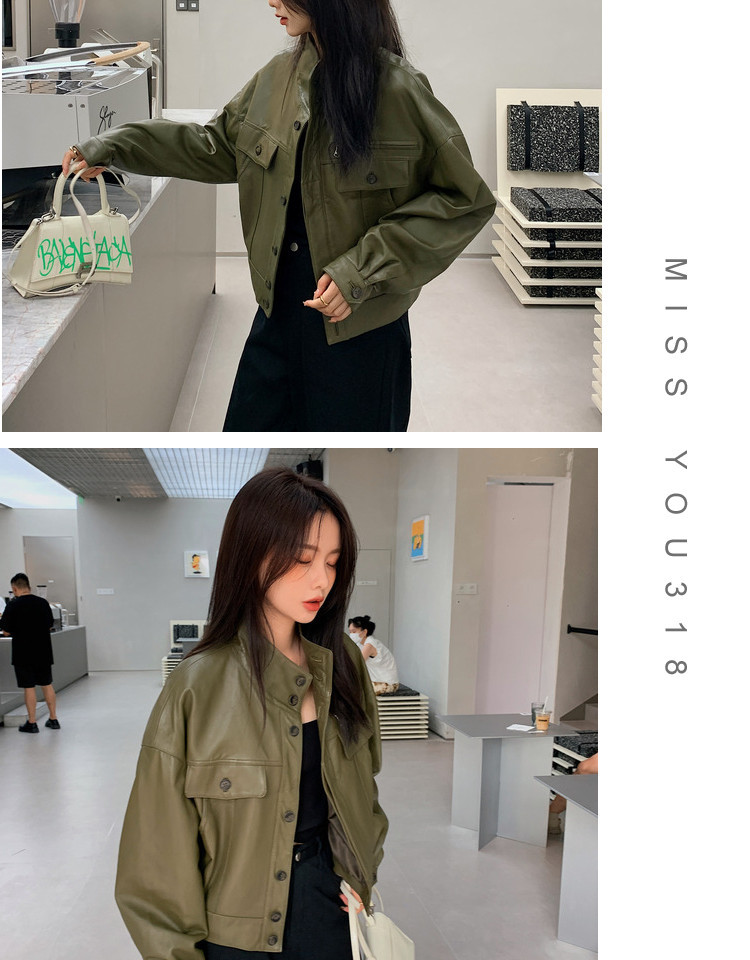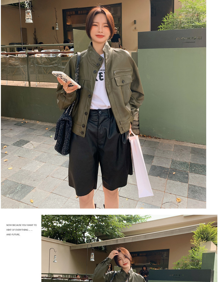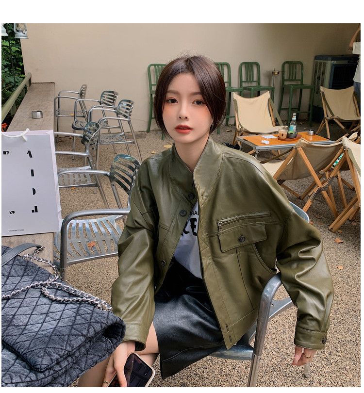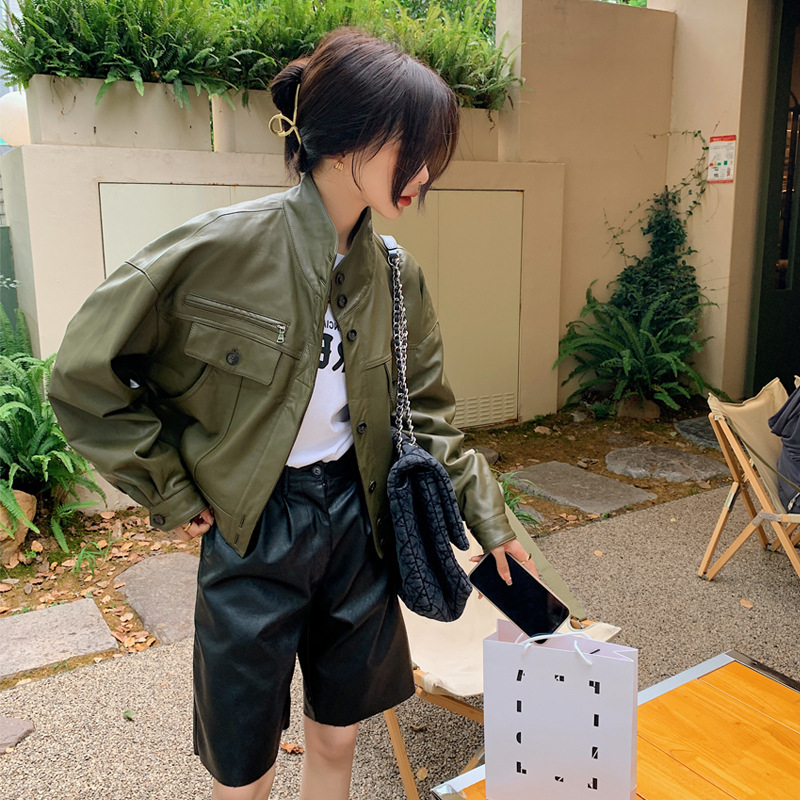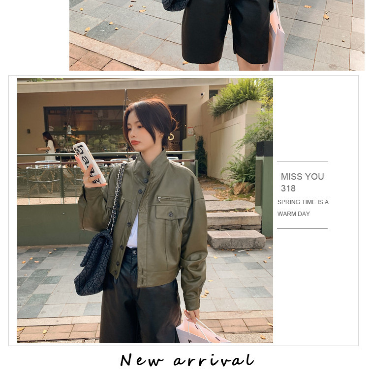 Hình chụp thật của áo khoác da pu cổ đứng mới màu xanh lá cây phong cách cổ điển dành cho nữ mùa xuân và mùa thu ngắn phần ngọn áo khoác biker nhỏ