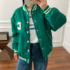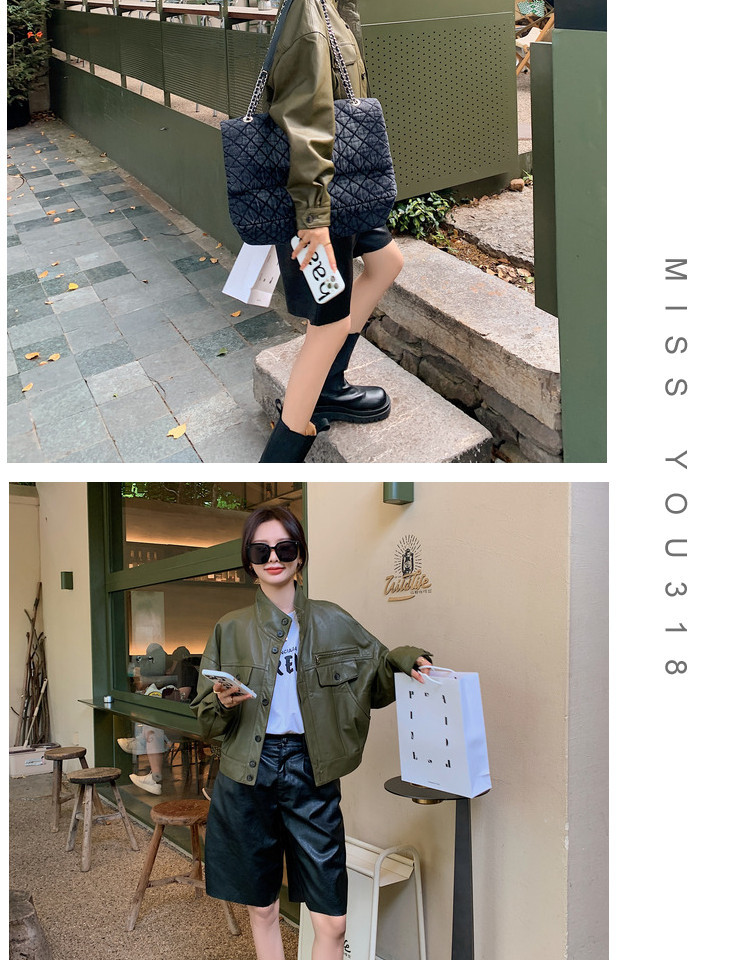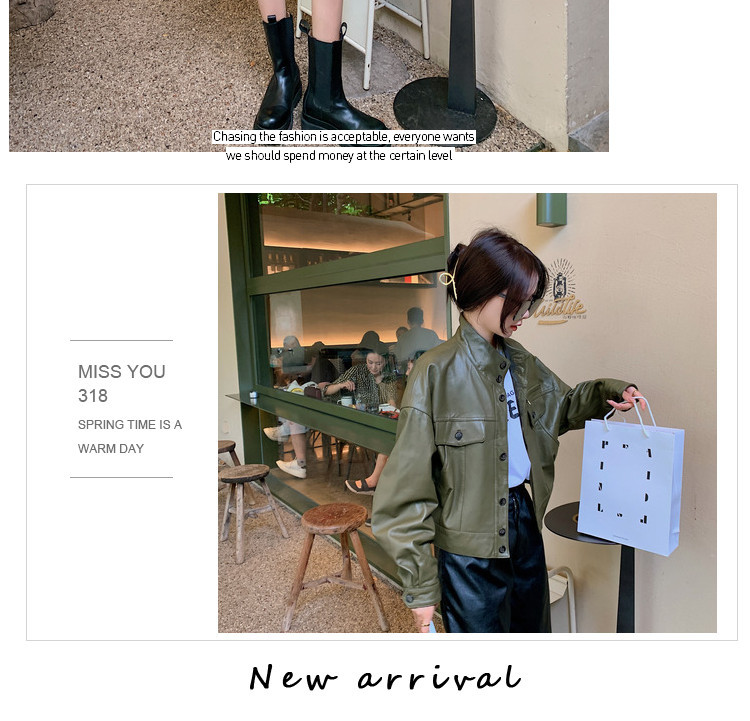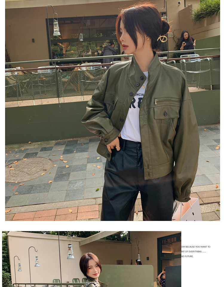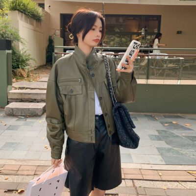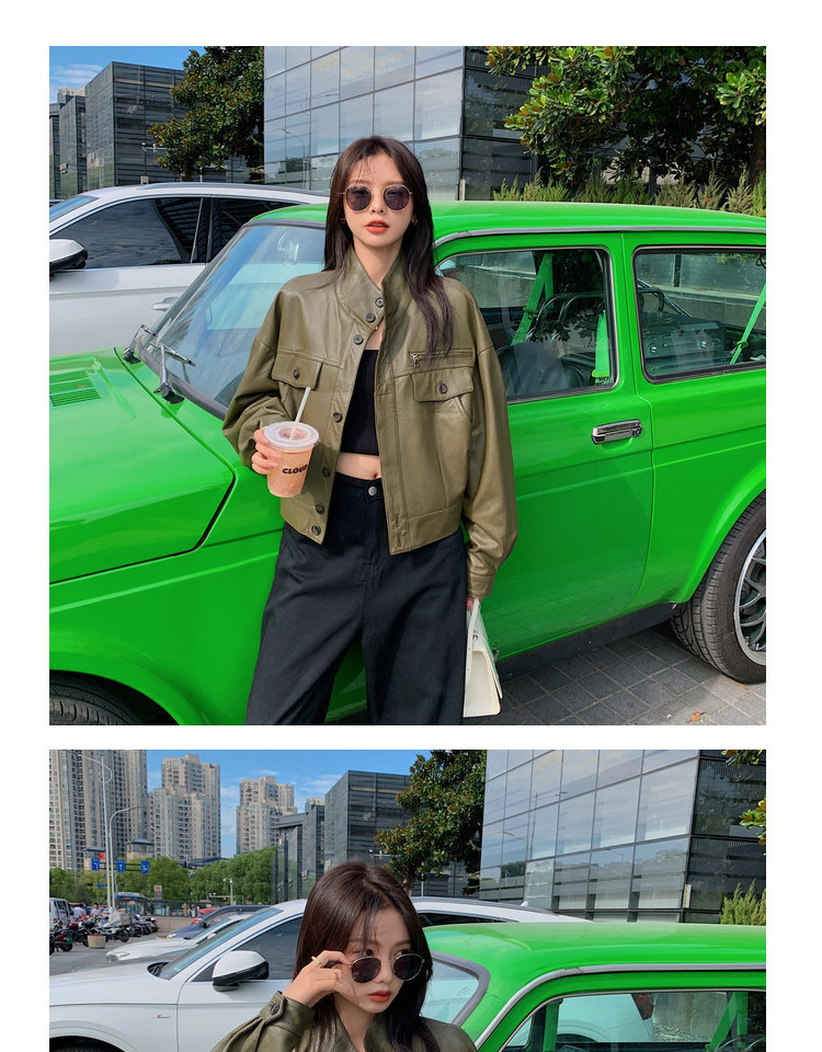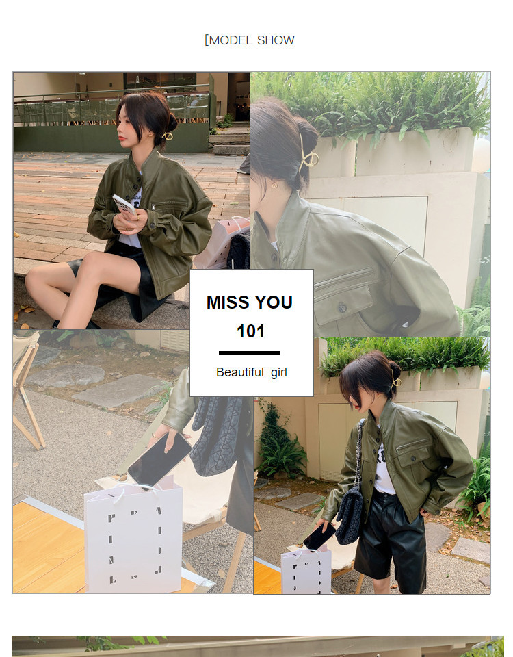 Hình chụp thật của áo khoác da pu cổ đứng mới màu xanh lá cây phong cách cổ điển dành cho nữ mùa xuân và mùa thu ngắn phần ngọn áo khoác biker nhỏ