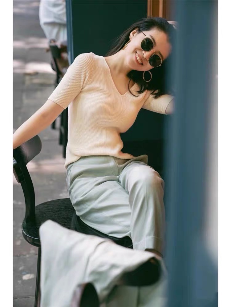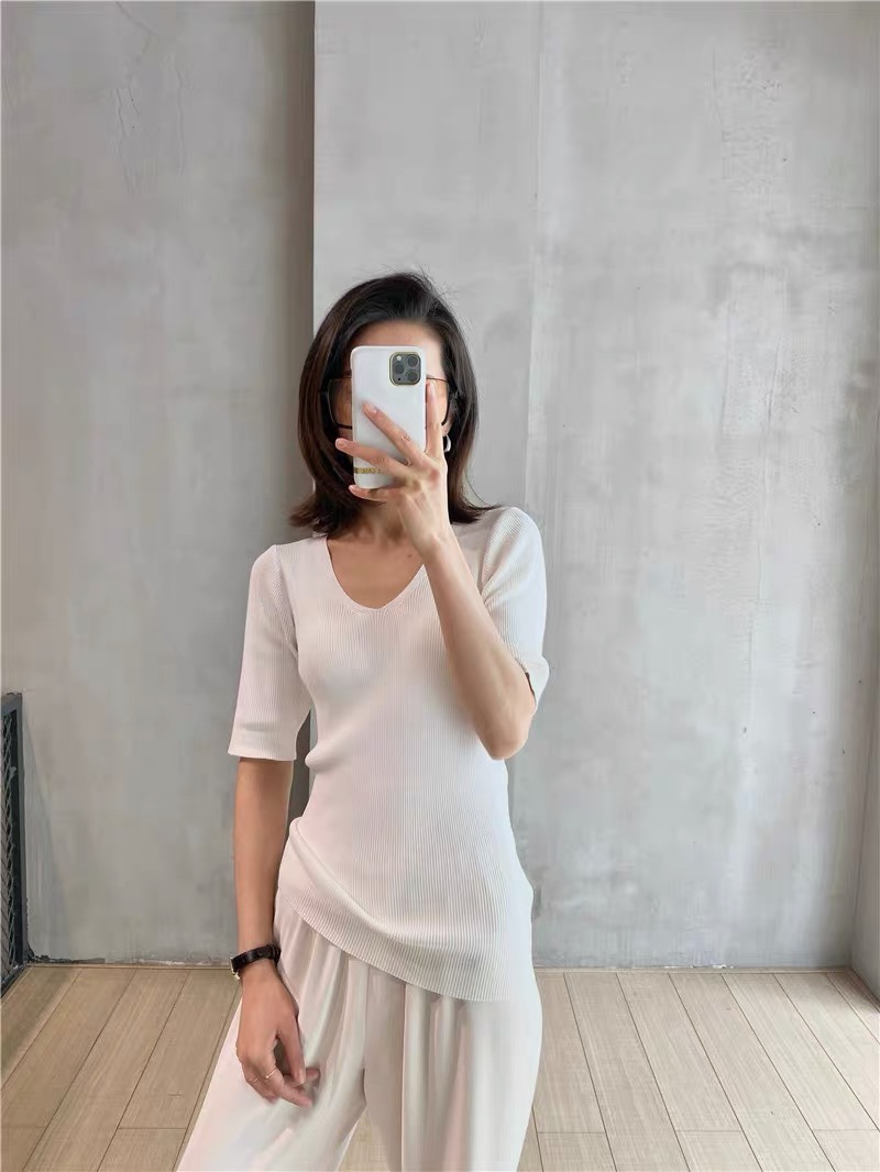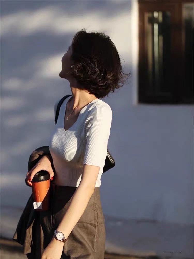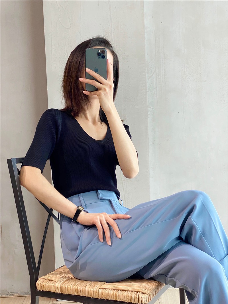 IC all-match áo thun ngắn tay cổ chữ V trên cùng áo len dệt kim màu đen và trắng hai màu băng đô áo pull nữ